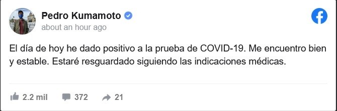 En su cuenta oficial de Facebook el excandidato a la alcaldía de Zapopan por Futuro, Pedro Kumamoto, anunció que dio positivo a la prueba de COVID-19, se encuentra estable.Alrededor de las 18:00 horas, el excandidato emitió este mensaje:“El día de hoy he dado positivo a la prueba de COVID-19. Me encuentro bien y estable. Estaré resguardado siguiendo las indicaciones médicas”, comentó el político en su red.Kumamoto tiene 31 años y es parte de los jóvenes afectados por la tercera ola de COVID-19. Según datos que dio a conocer el Gobierno estatal, la tendencia actual de esta tercera ola en su mayoría está afectando a la población de 20 a 34 años, sin letalidad.En rueda de prensa, el día de ayer el gobernador de Jalisco dijo que la positividad paso del 5 al 10.3 por ciento y el número de casos llegó a dos mil 560 en el último corte, además señaló que el 90 por ciento de las personas hospitalizadas recientemente no tenían vacuna.El gobernador en ese evento destacó que Jalisco está muy debajo de la media nacional en la incidencia de casos activos que hasta el momento se encuentran en una tasa de 46.53 por ciento, mientras que la de Jalisco se ubica en 23.32 por ciento.JM