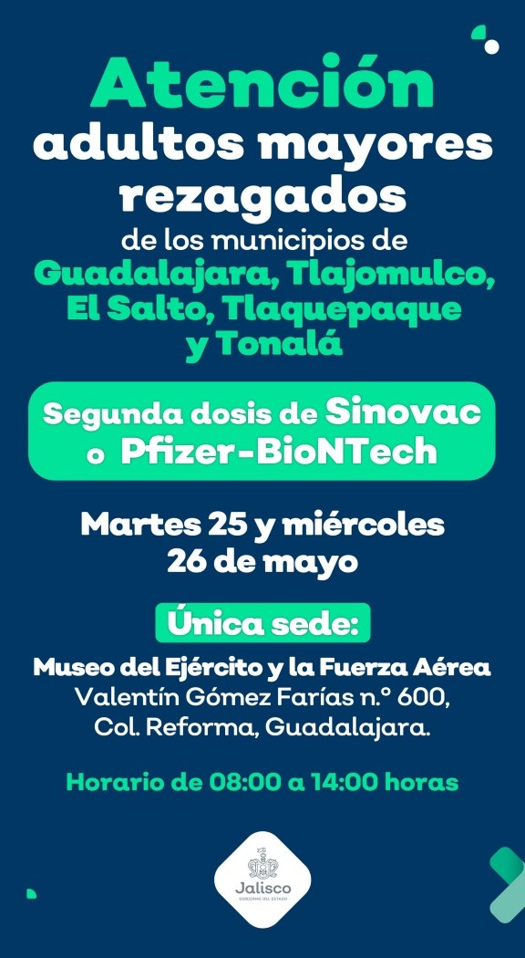 Con el fin de que adultos mayores de los municipios de Guadalajara, Tlajomulco, El Salto, Tlaquepaque y Tonalá que no pudieron acudir a las jornadas de vacunación anteriores, reciban sus segunda dosis anti COVID-19, la Secretaría de Salud Jalisco anunció la apertura de un módulo especial para la siguiente semana.La autoridad sanitaria detalla que la aplicación de la vacuna solo será para adultos mayores de 60 años que ya hayan recibido la primera dosis de los laboratorios Sinovac o Pfizer-BioNTech y que por alguna razón no pudieron recibir la segunda en las jornadas pasadas, por lo que esta será la última oportunidad para recuperarla.La vacunación extraordinaria se llevará a cabo los días martes 25 y miércoles 26 de mayo. La única sede estará ubicada en el Museo del Ejército y Fuerza Aérea, con dirección en Valentín Gómez Farías 600, colonia Reforma en Guadalajara. La atención se brindará en un horario de 8 am a 2 pm.NR
