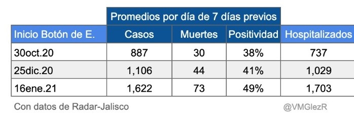 Jalisco encarará, a partir de mañana y hasta el 31 de enero, otro "botón de emergencia" con el doble de muertes, hospitalizados y casos de COVID-19.De acuerdo con un análisis que compartió Víctor Manuel González Romero, ex rector de la Universidad de Guadalajara (UdeG), en la semana previa al 30 de octubre, cuando se aplicó por primera vez esta restricción en el Estado, se registró un promedio de 30 muertes diarias. Sin embargo, en los últimos siete días el indicador subió a 73.En el mismo sentido, en su evaluación, que se basó en datos de Radar Jalisco, se destacó que en ambos periodos el promedio diario de las hospitalizaciones pasó de 737 a mil 703 y los casos de 887 a mil 622.Esta mañana, el gobernador de Jalisco anunció un nuevo "botonazo" que implica el cierre de gimnasios, cines, teatros, pero también prohibiciones para tianguis y corredores comerciales, entre otros espacios.El mandatario dijo que la decisión fue tomada por la Mesa de Salud luego del aumento de los contagios, que están en "el punto de mayor riesgo en todo lo que va de la emergencia sanitaria".Hasta el corte de anoche, Jalisco sumaba seis mil 861 defunciones por el nuevo coronavirus y 162 mil 527 casos confirmados.Este medio publicó que, según la Universidad de Washington, si continúa la tendencia se espera que para abril sean 10 mil los decesos en la Entidad por esta causa.NR