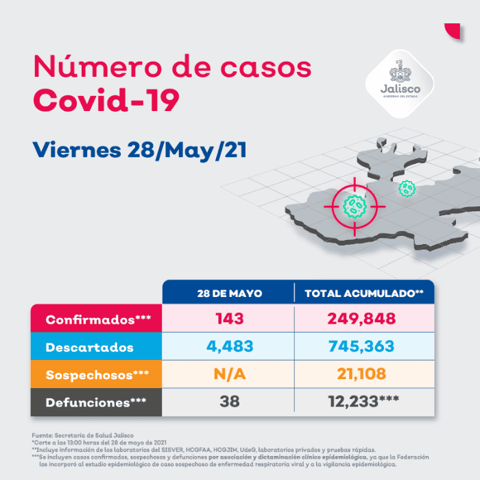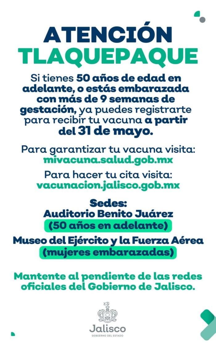 Tlaquepaque se integrará a los municipios de El Salto, Tonalá y Tlajomulco cuyos habitantes de 50 años en adelante así como mujeres embarazadas podrán acudir a recibir la primera dosis de la vacuna contra el COVID-19.La jornada de vacunación para estos grupos iniciará el próximo lunes 31 de mayo. Para las personas de 50 a 59 años la aplicación será en el macro módulo ubicado en el Auditorio Benito Juárez y en el caso de las mujeres mayores de edad con más de nueve semanas de gestación, estas deberán presentarse en el macro módulo habilitado en el Museo del Ejército y Fuerza Aérea en Guadalajara.La aplicación que desarrollará bajo el modelo estatal de vacunación, que consiste en la generación de citas y horarios preestablecidos, con lo cual se espera una jornada ágil.Las personas interesadas deberán registrar su cita en el portal https://vacunacion.jalisco.gob.mx/, así como en el portal federal de https://mivacuna.salud.gob.mx/index.php para garantizar su vacuna.Para recibir orientación sobre el proceso de registro se puede llamar a la línea telefónica 33 3823 3220, con un horario de lunes a domingo de 8:00 de la mañana a 8:00 de la noche.Hasta el corte del día de ayer, Jalisco acumula 249 mil 848 casos confirmados, así como un total de 12 mil 233 defunciones por COVID-19.Ante casos sospechosos se puede llamar al número 33 3823 3220 de la Secretaría de Salud Jalisco o a la línea 33 3540 3001 de la Universidad de Guadalajara, donde se dará orientación y/o cita para la prueba gratuita en alguno de los centros de toma de muestra.La autoridad recuerda que la pandemia sigue activa y por tanto se deben seguir las medidas sanitarias vigentes, como usar cubrebocas adecuadamente, permanecer por corto tiempo en espacios públicos, mantener distancia de 1.5 metros entre personas, y lavarse frecuentemente las manos con agua y jabón o usar gel alcoholado al 70 por ciento.Si se presentan síntomas como tos persistente, dificultad respiratoria, fiebre que no cede o la oxigenación en sangre disminuye a menos de 92 debe acudir a una unidad de urgencias y no esperar una prueba confirmatoria de COVID-19.NR