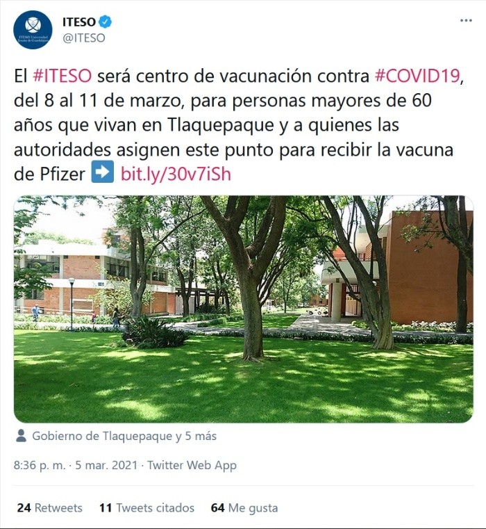 A través de un comunicado, el ITESO anunció que del 8 al 11 de marzo sus instalaciones serán utilizadas como centro para la vacunación de seis mil adultos mayores de 60 años de Tlaquepaque; la universidad asevera que, de esta manera, el municipio contará con 26 centros que aplicarán 59 mil dosis.El ITESO asegura que brindará todas las facilidades a la Secretaría de la Defensa Nacional (Sedena) para el resguardo y transporte de las vacunas, así como a la Secretaría de Salud para la aplicación de las dosis, y a la Secretaría del Bienestar Social para la logística. También colaborarán la Secretaría de Salud Jalisco y la Secretaría General de Gobierno, así como el gobierno municipal de San Pedro Tlaquepaque.Aseguran que el campus es amplio, por lo que la aplicación de las vacunas será accesible y ágil, todo esto sin afectar a las clases que tendrán lugar en laboratorios y talleres.Informan asimismo que, durante los días de la vacunación, el ingreso vehicular al campus para los integrantes de la universidad será a través de las entradas alternativas sobre Periférico y el acceso sur por la calle Independencia.El ingreso de las personas que se vacunarán será por el estacionamiento externo que está a espaldas del Auditorio Pedro Arrupe, lugar en el que se realizará el registro, la vacunación y observación de los adultos mayores.La Secretaría de Bienestar será la encargada de convocar por teléfono, perifoneo o correo a quienes deberán asistir al ITESO para ser vacunados y verificará los listados al ingreso del módulo de vacunación. Las personas deberán presentar su identificación oficial, un comprobante de domicilio del municipio de Tlaquepaque y su folio del registro de vacunación.JM