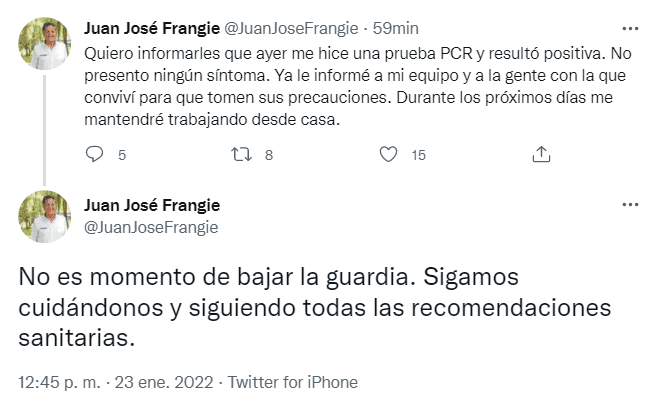 El presidente municipal de Zapopan, Juan José Frangie anunció hoy domingo a través de redes sociales que dio positivo a la prueba de COVID. En su mensaje, Frangie afirmó que no presentaba ningún síntoma, sin embargo, avisó a las personas con las que estuvo conviviendo estos últimos días. También notificó que estará trabajando desde casa."Quiero informarles que ayer me hice una prueba PCR y resultó positiva. No presento ningún síntoma. Ya le informé a mi equipo y a la gente con la que conviví para que tomen sus precauciones. Durante los próximos días me mantendré trabajando desde casa".Además, Frangie pidió a los jaliscienses no bajar la guardia y seguir todas las recomendaciones sanitarias para evitar más contagios, que en el Estado ya suman 447 mil 330 casos por COVID y casi 18 mil muertes. Apenas el pasado 20 de enero, el gobernador de Jalisco dijo a través de redes sociales que había dado positivo a COVID, por lo que se quedaría en casa durante la cuarentena. GC
