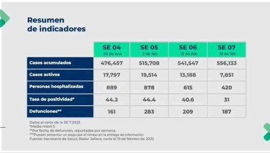 Aunque el gobernador de Jalisco reconoce que la cifra de los casos activos de COVID en el Estado continúa alta con respecto a otras olas, anunció en rueda de prensa que se relajarán algunas medidas contra el coronavirus en Jalisco.Actualmente se registran siete mil 851 casos activos y 420 personas hospitalizadas por COVID en el Estado. La tasa de positividad de las pruebas es de 31%.En la última semana fallecieron 187 personas por COVID en Jalisco.El mandatario estatal señaló que la tendencia de los contagios va a la baja, por lo que prevén que las restricciones sean menores para algunas actividades recreativas a partir de la siguiente semana.Será este viernes, dijo, cuando la Mesa de Salud determine cuáles serán los nuevos aforos para salones de eventos, teatros, estadios y otros espacios similares.Adelantó que la capacidad en los estadios se ampliaría de 60 a 80 por ciento.Incluso refirió que analizarán que los eventos religiosos de Semana Santa puedan realizarse con normalidad.Sin embargo, por el momento continúa la petición del certificado de vacunación o prueba negativa en bares, casinos, centros nocturnos, eventos masivos y otros establecimientos.