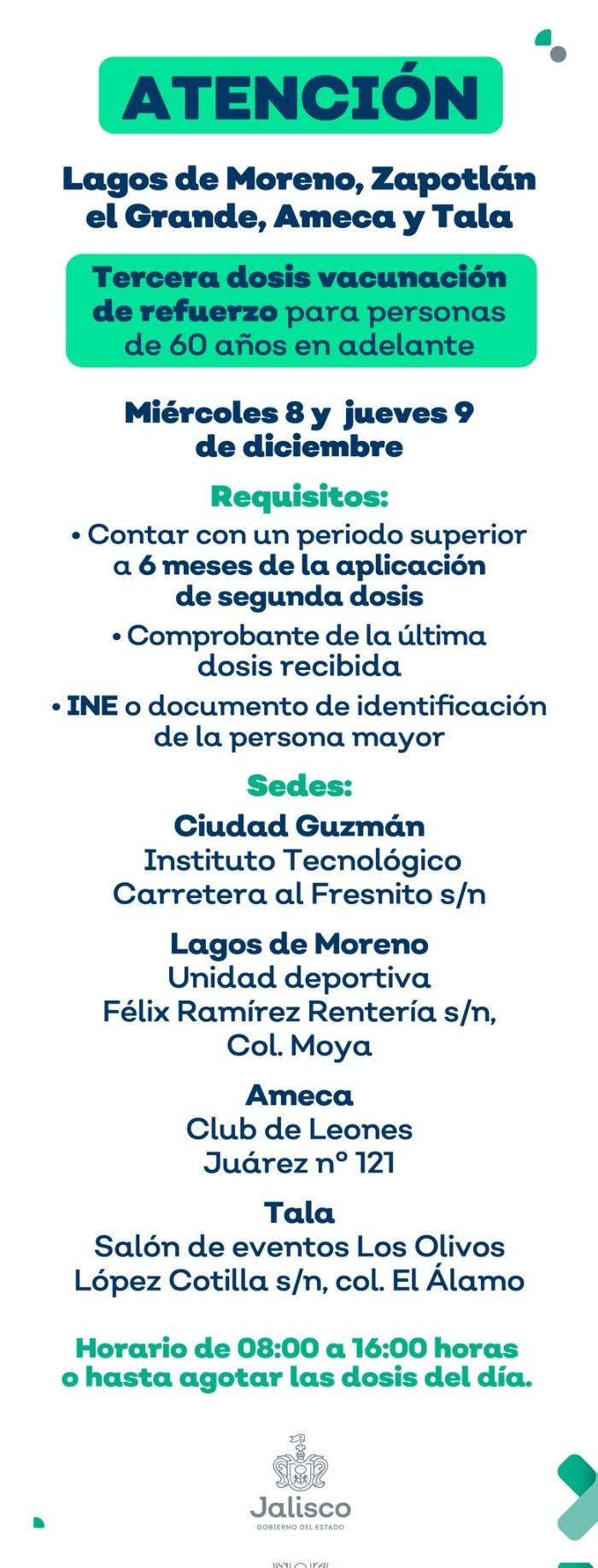 Este martes el subsecretario de Prevención y Promoción de la Salud, Hugo López-Gatell, informó sobre la aplicación de refuerzo contra COVID-19 para mayores de 60 años.Al respecto, el secretario de Salud Jalisco, Fernando Petersen, informó que la aplicación de esta dosis para adultos mayores comienza hoy en nuestro Estado en los centros de salud de cuatro municipios del interior del Estado: Ameca, Tala, Lagos de Moreno, y Ciudad Guzmán. Durante la semana, añadió, se informará sobre otros 25 municipios donde también se aplicará la inmunización de refuerzo para llegar a un total de 29 en el interior del Estado en esta primera etapa."No se necesita registro previo en la página de Mi Vacuna. Solo se necesitará una identificación que compruebe la edad de las personas a vacunar y la papeleta de la última dosis de vacunación aplicada o el expediente de vacunación", expresó el secretario.Añadió que esta semana también se comenzará con la vacuna de refuerzo para adultos mayores del Área Metropolitana de Guadalajara bajo el "Modelo Jalisco", es decir, las personas mayores de 60 años que vivan en el AMG, sí deberán registrarse en la plataforma estatal para obtener su cita y evitar largas esperas."Estaremos informando sobre la apertura de la plataforma a través de los canales oficiales. El biológico se estará aplicando tanto en el macromódulo del auditorio Benito Juárez, como en el Centro Administrativo de Tlajomulco", manifestó el secretario.La inmunización, señaló el secretario, será para todos los adultos mayores de 60 años con esquema completo de vacunación (ya sea que hayan recibido una dosis de Cansino o J&J o dos del resto de laboratorios), y solo se requiere que hayan pasado al menos seis meses de la última dosis aplicada.En todos los casos, el refuerzo que se aplicará será con la vacuna del laboratorio AstraZeneca, y se dará prioridad a aquellas personas que recibieron la unidosis de Cansino, finalizó Petersen Farah.OA