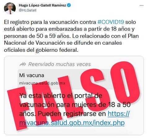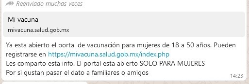 Alejandra tiene 27 años y se registró para recibir la vacuna contra el COVID-19 sin estar embarazada.La joven señala que una compañera de trabajo le dijo que podía apuntar sus datos en el registro de vacunas de la página oficial del Gobierno.Indica que al llegar al apartado donde se le preguntó si estaba embarazada ella puso que no."No sabía que nada más era para las mujeres embarazadas. Le puse que no pero aún así mi registro ya queda para cuando terminen con las embarazadas", señala.Al terminar el registro le enviaron un expediente con el número de folio de "Mi vacuna" sin embargo no sabe si le hablaran para recibir la vacuna.En la aplicación de Whatsapp también circula un mensaje falso que promueve la vacunación para mujeres de 18 a 50 pero no especifica que sólo es para embarazadas."Ya esta abierto el portal de vacunación para mujeres de 18 a 50 años. Pueden registrarse en mi vacuna. Les comparto esta info. El portal esta abierto SOLO PARA MUJERES. Por si gustan pasar el dato a familiares o amigos", se lee en el mensaje.El pasado 11 de mayo el Gobierno de México anunció el inicio de vacunación para mujeres a partir de nueve semanas de embarazo independientemente de su edad.El Presidente Andrés Manuel López Obrador dijo durante su conferencia de prensa que "Pueden recibir su vacunación de cualquier tipo de vacuna. Todas las vacunas disponibles en México son seguras. Se pueden aplicar durante el embarazo y el beneficio que tienen es muy importante".Por su parte, Hugo López-Gatell señaló que el registro solo está abierto para embarazadas a partir de 18 años y personas de 50-59 años."El registro para la vacunación contra #COVID19 solo está abierto para embarazadas a partir de 18 años y personas de 50 a 59 años. Lo relacionado con el Plan Nacional de Vacunación se difunde en canales oficiales del gobierno federal", escribió el Subsecretario en Twitter.Hasta ahora el país, que cuenta con 126 millones de habitantes, ha administrado 21.3 millones de dosis de cinco vacunas diferentes a personal sanitario, maestros y mayores de 60 años.jb