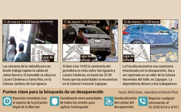 Pese a que el fiscal estatal, Luis Joaquín Méndez, compartió ayer que tienen imágenes del recorrido que tuvo la camioneta del periodista Jaime Barrera tras ser plagiado la tarde del lunes, no hay grabaciones de las tres o cuatro personas que se lo llevaron, luego de salir de las oficinas de la radiodifusora en la que trabaja. “De todo el seguimiento que tenemos en cámaras, no hay una imagen o una información gráfica de que se haya dado una privación (ilegal de la libertad). Y lo que tenemos identificado es el vehículo (del comunicador) por la información que nos da la familia”, comentó el funcionario.Otra vez, el sistema Escudo Urbano C5, que cuenta con seis mil 530 cámaras de videovigilancia y dos mil 585 puntos de monitoreo inteligentes, fue inoperante para detener a quienes privaron de la libertad a Barrera al dejar su trabajo y después del traslado en su vehículo.Para Adolfo Gómez, especialista en Derecho Penal, el tiempo transcurrido entre la desaparición de Barrera y el hallazgo de su vehículo, así como la descoordinación entre autoridades estatales y municipales, fueron fallas que entorpecieron la investigación. “Las cámaras leen las placas reportadas (como robadas), no todas las que pasan. Por lo tanto, se necesita activar una alerta para buscar una placa en específico. Por eso el tiempo es crucial en estos casos”, dijo. El periodista fue localizado con vida esta madrugada, presuntamente por un opertivo de la Guardia Nacional. La Fiscalía del Estado señaló que continuará con la investigación para esclarecer los hechos y dar con los responsables.