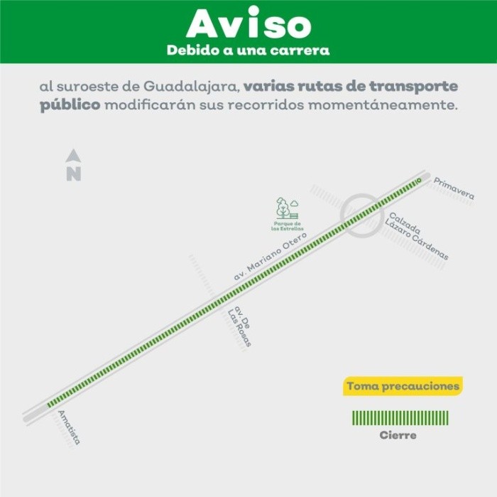 Este domingo 21 de abril se celebrará una carrera atlética sobre los carriles centrales de la avenida Mariano Otero en Guadalajara, a partir de las 07:00 horas, por tal motivo varias rutas del transporte público modificarán sus recorridos, mientras que otras se detendrán al paso del contingente.El contingente de participantes iniciará su recorrido en la avenida Mariano Otero, a la altura de la calle Amatista, avanzará rumbo al nororiente y al llegar a la calle Primavera se retornará sobre la misma vialidad, continuará de regreso por avenida Mariano Otero hasta encontrarse con la meta. Las rutas del transporte público que modificarán su recorrido de forma momentánea serán las siguientes:Las rutas que detendrán su recorrido únicamente mientras pasa el contingente serán las siguientes:EE