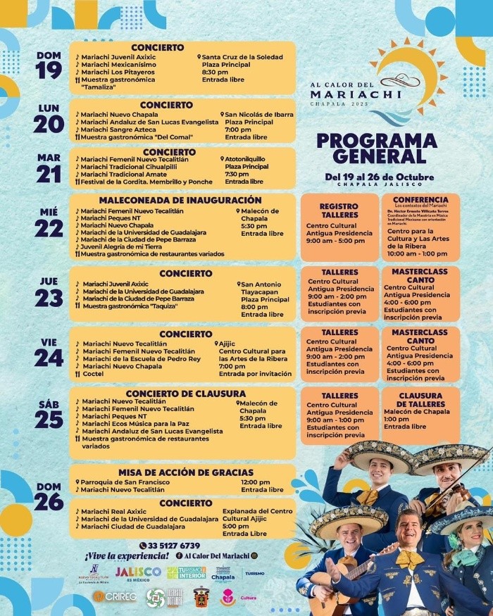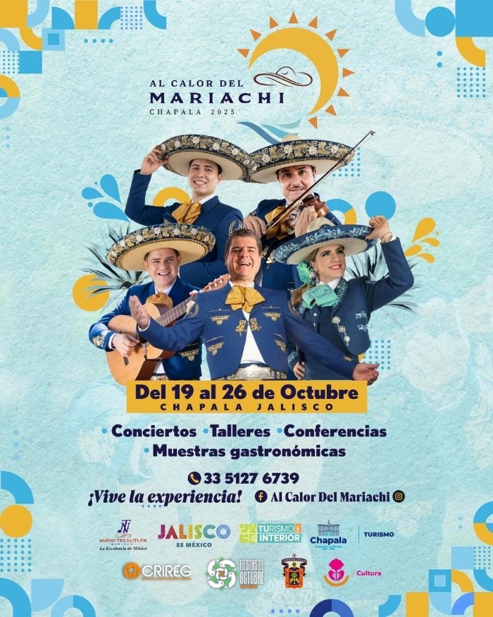 Chapala se prepara para vivir una semana llena de música, cultura y sabor con la realización del Festival Al Calor del Mariachi 2025, que tendrá lugar del 19 al 26 de octubre; este encuentro académico, turístico y gastronómico formará parte de los festejos por el 60 aniversario del Mariachi Nuevo Tecalitlán y las Fiestas de Octubre, consolidándose como un homenaje a la tradición del mariachi en México.El evento reunirá a más de 150 estudiantes provenientes de México, Estados Unidos, Canadá y Colombia, quienes tendrán la oportunidad de conocer por primera vez la tierra que ha inspirado las canciones que interpretan sobre la cultura y las tradiciones mexicanas.Durante la semana del festival, el público podrá disfrutar de conciertos gratuitos en plazas y delegaciones del municipio, maleconadas bajo la luna de octubre, y un pabellón gastronómico con los sabores más representativos de la región. Además, se ofrecerán talleres de profesionalización musical impartidos por los maestros del Mariachi Nuevo Tecalitlán, con especialidades en violín, guitarra, vihuela, guitarrón, trompeta, arpa y voz, así como masterclass y conferencias abiertas al público, dirigidas por músicos e historiadores de la Universidad de Guadalajara, cabe destacar que cada participante recibirá un reconocimiento académico del Centro Universitario de Chapala.La gastronomía será otro de los grandes atractivos del festival, pues se instalarán espacios abiertos y gratuitos para que restauranteros, cocineras tradicionales y productores locales compartan sus mejores platillos.Cada delegación contará con su propio sello culinario: Atotonilquillo celebrará el Festival de las Gorditas y el Membrillo; San Nicolás, el Festival del Comal; San Antonio Tlayacapan, el Festival del Taco; y Chapala albergará el pabellón principal, donde participarán destacados restaurantes y productores de la región.El público podrá disfrutarlo en dos momentos clave: la inauguración el miércoles 22 en el Malecón de Chapala y el sábado 25 en la clausura en el malecón.El Festival Al Calor del Mariachi 2025 es el resultado de la colaboración entre diversas instituciones públicas y privadas. La organización está encabezada por el Mariachi Nuevo Tecalitlán, el Gobierno Municipal de Chapala y CRIREG, con el respaldo de la Secretaría de Turismo de Jalisco, la Secretaría de Cultura, la Universidad de Guadalajara, la Agencia Estatal de Entretenimiento y la Oficina de Visitantes y Convenciones de Guadalajara.Durante la presentación del programa, se destacó el papel fundamental de la Secretaría de Turismo, que ha permitido dar al festival un alcance internacional, posicionando a Chapala como un destino gastronómico, musical y cultural. También se reconoció el apoyo del Patronato, que hace posible ofrecer actividades gratuitas para toda la comunidad, y del Gobierno Municipal, encabezado por el licenciado Alejandro Aguirre Curiel, quien ha promovido un evento que integra a los sectores público, privado y social en torno a la identidad chapalense.Se prevé la asistencia de más de 25 mil personas durante la semana del festival, lo que generará una importante derrama económica para la región, para facilitar la visita de los asistentes, se han establecido convenios con hoteles de Chapala —entre ellos, el Hotel Memora, que fungirá como sede oficial—, además de descuentos en restaurantes y alianzas con aerolíneas que refuerzan la hospitalidad del destino.El evento concluirá con un espectáculo de clausura inolvidable: el Mariachi Nuevo Tecalitlán se presentará en el Cristo Pescador, teniendo como telón de fondo el majestuoso Lago de Chapala, este concierto será el broche de oro de una semana dedicada a celebrar la música, la cultura y la gastronomía mexicana, en un ambiente familiar, festivo y lleno de identidad.NA