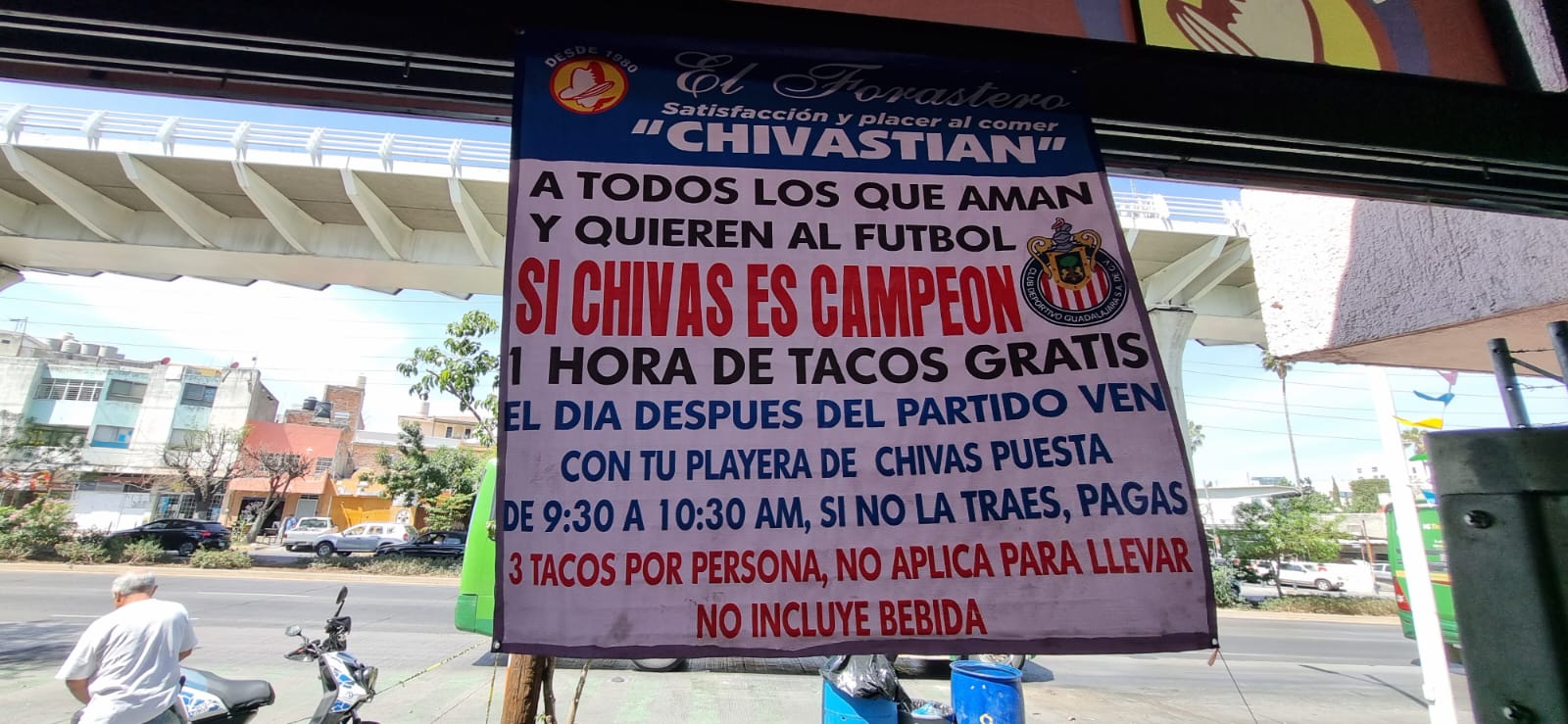 Las esperanzas de que el equipo de las Chivas se levante como el posible ganador de la jornada de la Liga MX ya se manifiestan entre los aficionados del fútbol.El primer Duelo será contra el América y, aunque en el pasado 18 de marzo fueron derrotados con cuatro goles por dos, no cabe duda que la afición pronostica una victoria en su casa para el rebaño sagrado. A las celebraciones y esperanzas se une el equipo de “El Forastero Chivastiano” que sin faltar año con año hace la promesa de que en caso de que se consolide la victoria para el equipo de Guadalajara y se proclame campeón se regalarán, sin parar, tacos de barbacoa para cada aficionado que porte la playera del equipo.“Uno se siente un orgullo de ser de las Chivas, se siente contento y pues esperemos que ahora sí nos toque. Regalar no importa, que se regale lo que sea, pero que ganen Chivas, eso es lo que nos importa y compartirlo con toda la afición”, compartió Jonathan Velázquez, propietario del sitio. Jonathan recuerda que desde que su papá tuvo la idea la tradición se ha sostenido desde 1987 y cada que se acerca el campeonato se hace la promesa que en caso de ser campeón el restaurante, que en la actualidad es una pintoresca terraza, regalará por una hora 3 tacos de barbacoa a quien porte la playera del equipo el día después del triunfo.“Se regala tres tacos por persona y se empieza desde las 9:30 de la mañana y hasta las… Se supone que es una hora aproximadamente, pero la verdad es que como se dan fichas, pues la gente, que la verdad sí viene mucha gente, a veces dura hasta la 1:00 de la tarde y ahí andamos acabando regalando tacos”, afirmó. Los comensales presentes y personas que transitan por la vialidad a ver la lona con las indicaciones apuntan que se sienten ansiosos por la victoria de las Chivas y celebrar una vez más que son campeones.“Da mucho placer ver cómo nos unimos para celebrar el deporte, acá las chivas son el equipo oficial y son el mejor equipo de México. No cabe duda que van a ganar y si ganan Pues nos venimos aquí a desayunar ya la armamos”, dijo Agustín Vera. “Me ha tocado una vez, fue en el 2017, y aquí andaban cumpliendo su promesa, ojalá Dios nos conceda la victoria, esta vez no hay que dudarlo, nos vamos contra Monterrey, hoy ganamos y volveremos a comer tacos” afirmó Ernesto.El único requisito para disfrutar de la promoción es primero, por supuesto, que ganen las Chivas, el segundo es que el día después se acuda al local ubicado sobre la avenida Ávila Camacho #1800 a las 9:30 de la mañana, de ser posible antes porque en se satura la fila, y como último requisito, si eres verdadero fan, deberás traer la playera del equipo.FS