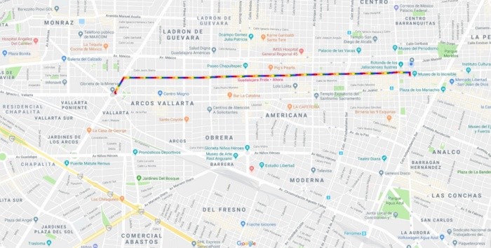 A partir de las 14:00 horas simpatizantes de la marcha por el orgullo gay salieron de La Minerva con rumbo hacia Plaza Liberación, informaron Bomberos de Guadalajara, quienes además resguardan el contingente con 22 agentes, al mando del director operativo y cuatro unidades de prevención.La asistencia es cercana a las 10 mil personas, de acuerdo con datos de Protección Civil y Bomberos; además se contabilizan cerca de 50 carros alegóricos.Las personas acuden a la manifestación para mostrar su orgullo #LGBTTTI y exigir sus derechos, así como festejar quiénes son.Al punto de las 16:16 horas se encontraban circulando por Hidalgo, por lo que se recomienda a los conductores cercanos tener precaución.Google Maps mantiene la ruta con los colores de la bandera de este movimiento.SA
