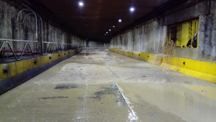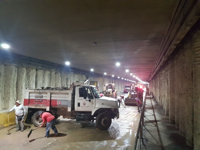 Luego de la lluvia registrada esta tarde en el centro de Guadalajara, el túnel de Av. Hidalgo se vio inundado de lodo, por lo que fue necesario cerrar su circulación de manera preventiva.Personal de Protección Civil y Bomberos de Guadalajara indicó que la tierra proviene de una obra, pero aún no se ha podido determinar de cuál con exactitud. También informó que, de momento, han encontrado siete metros cúbicos de arrastre en el material que obstruye el túnel en un primer frente. El personal se encuentra trabajando para retirar el lodo en este primer frente, pero existen otros dos en el túnel que, estiman, presentarán otros siete metros cúbicos de material cada uno. Afirmaron que las labores se realizan con el objetivo de reabrir el túnel lo antes posible, pero que se trata de “una labor algo lenta”.ActualizaciónBomberos de Guadalajara informó que a las 20:00 horas aproximadamente el túnel fue reabierto a la circulación.NM