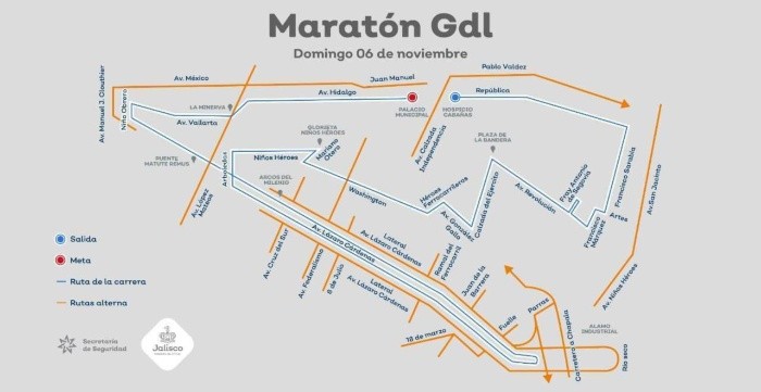 La Policía Vial informó que desplegará un operativo en torno al Maratón de Guadalajara que se realizará este domingo 6 de noviembre en diferentes vialidades de la Perla tapatía.En un comunicado se informó que oficiales viales brindarán resguardo en la vanguardia y retaguardia del recorrido, así como en la totalidad del trayecto, para hacer los cortes a la circulación correspondientes y ayudar a los automovilistas que requieran utilizar una ruta alterna.Se detalló que se tiene previsto que las actividades inicien en punto de las 06:20 horas, por lo que las calles y avenidas que comprenden la ruta del maratón serán cerradas desde las 05:00 horas y volverán a habilitarse una vez que haya pasado la totalidad del contingente.Salida en avenida República al cruce con calle Cabañas – calle Francisco Sarabia / Ramón López Velarde – calle Artes – calle Francisco Márquez – calzada Revolución – Fray Antonio de Segovia - calzada Revolución - calzada del Ejército – calzada González Gallo – avenida Héroes Ferrocarrileros – Circunvalación Agustín Yáñez – avenida Mariano Otero - avenida Niños Héroes – avenida Paseo de la Arboleda - calzada Lázaro Cárdenas hasta calle Parras (Álamo Industrial)- retorno para continuar por calzada Lázaro Cárdenas hacia el poniente – avenida Niño Obrero – avenida Vallarta – avenida López Mateos – avenida Hidalgo – meta en inmediaciones de la Presidencia Municipal de Guadalajara.Los carriles laterales de calzada Lázaro Cárdenas, dentro del tramo que comprende la ruta del evento, permanecerán habilitados en ambos sentidos, desde el Mercado de Abastos, en caso de dirigirse al oriente, y desde avenida Río Seco hasta el Mercado de Abastos, esto en el sentido oriente – poniente.Asimismo, los carriles centrales de avenida López Mateos, en la zona de la Glorieta Minerva, estarán abiertos a la circulación, a excepción del túnel de incorporación a avenida Hidalgo.La Policía Vial solicitó a los conductores anticipar y planificar sus traslados, además de utilizar las diferentes rutas alternas, las cuales pueden ser las siguientes:• Calzada Independencia • Av. Pablo Valdez • Av. San Jacinto • Av. Niños Héroes (Tlaquepaque) • Av. Solidaridad / Carretera a Chapala • Calle Fuelle • Av. 18 de Marzo y Juan de la Barrera • Av. Ramal del Ferrocarril • Av. 8 de Julio • Av. Colón / Federalismo • Av. Cruz del Sur • Av. López Mateos • Carriles laterales de calzada Lázaro Cárdenas (entre Mercado de Abastos y avenida Río Seco) • Av. Clouthier • Av. México • Calle Juan Manuel • Calle López CotillaOF