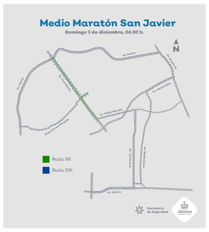 El próximo domingo se llevará a cabo el medio maratón San Javier en su edición 39. Por ello, la Secretaría de Seguridad del Estado (SSE), a través de la Comisaría de la Policía Vial, informó que apoyará con vigilancia y supervisión en el cierre de vialidades.La competencia tendrá como salida y meta, el exterior del Club San Javier ubicado en Paseo de las Peñas 3500, en la colonia Colinas de San Javier. El disparo de salida está programado para las 06:25 horas.El circuito de la carrera donde esperan la participación de dos mil 500 personas, incluye las avenidas Patria, Américas, Montevideo, Rubén Darío, Juan Palomar y Arias, México, Terranova, Pablo Neruda, Acueducto y Paseo de los Parques.“La Comisaría de la Policía Vial, exhorta a la ciudadanía a tomar precauciones, anticipar sus tiempos de traslado, tomar vías alternas y respetar las indicaciones de los oficiales”, indicó la Secretaría de Seguridad.Para mayor información, la corporación le recuerda sus redes sociales:*Mantente al día con las noticias, únete a nuestro canal de WhatsApp MF