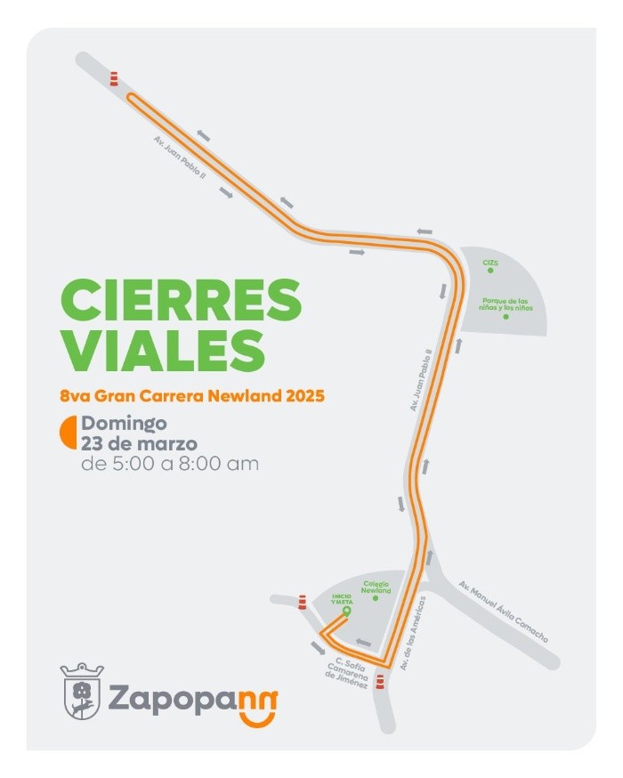 Con motivo de la 8va. Gran Carrera Newland 2025 habrá cierres viales el próximo domingo 23 de marzo en el municipio de Zapopan de 5:00 a 8:00 de la mañana.Con el lema “Corriendo contra el cáncer” el Colegio Newland School y Tim2 con el aval de la Asociación Jalisciense de Clubes Atléticos A.C convocan a participar en la 8va. Gran Carrera Newland 2025, en beneficio de la fundación Nariz Roja la cual apoya a niños, niñas y jóvenes con cáncer. El Gobierno de Zapopan informó a través de sus redes sociales que la salida y la meta será en el estacionamiento de Newland School sobre la Calle 5 de Mayo 388 A, por lo que las siguientes avenidas y calles forman parte de los cierres viales con motivo de dicho evento deportivo:NA
