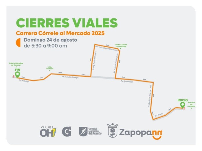La Dirección de Movilidad y Transporte Zapopan informó que el próximo domingo 24 de agosto habrá cierres viales en el municipio por la carrera Córrele al Mercado 2025, por ello la dependencia pidió a la ciudadanía tomar sus precauciones y anticipar sus trayectos.Córrele al Mercado 2025 forma parte del Serial de Carreras para Todas y Todos 2025, que tiene como objetivo impulsar el comercio local, recorriendo una ruta que conecta mercados emblemáticos y el corazón de nuestra ciudad.Dicho evento deportivo se realizará el domingo 24 de agosto de 5:30 a 9:00 am, por lo que algunas vialidades de Zapopan se cerrarán con la finalidad de que las y los corredores puedan participar en la carrera de forma segura.Puedes consular la ruta de la carrera en el siguiente mapa:NA