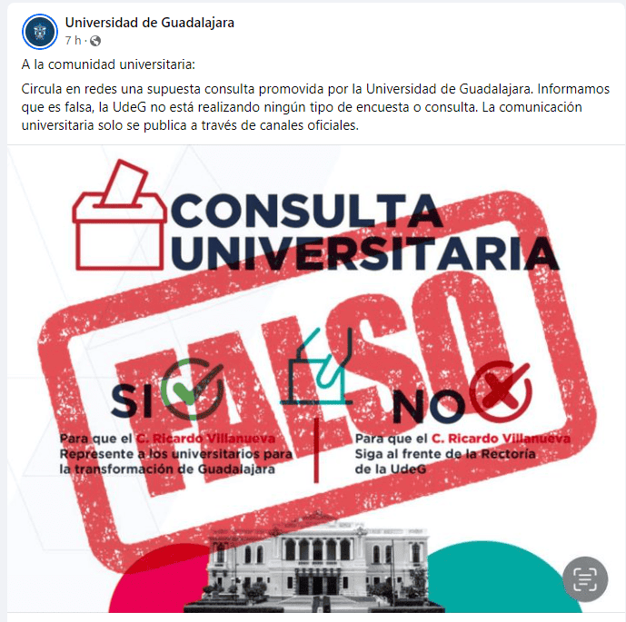 La Universidad de Guadalajara dio a conocer hoy que circula en redes sociales una supuesta consulta promovida por la Universidad de Guadalajara.La supuesta “consulta universitaria” pregunta si el actual rector, Ricardo Villanueva Lomelí, debería seguir al frente de la institución o buscar “la transformación de Guadalajara”, haciendo alusión a la Alcaldía del municipio.En sus diversas plataformas la casa de estudios aclaró que la encuesta es falsa y no busca promover la imagen de Ricardo Villanueva. “La UdeG no está realizando ningún tipo de encuesta o consulta. La comunicación universitaria solo se publica a través de canales oficiales”, afirmó.MM