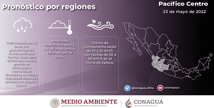 Las previsiones meteorológicas para este lunes indican lluvias puntuales intensas en regiones de Chiapas, Nuevo León, San Luis Potosí y Tamaulipas, de acuerdo con el pronóstico de la Comisión Nacional del Agua (Conagua).También, habrá lluvias muy fuertes en zonas de Coahuila y Oaxaca; fuertes (de 25 a 50 mm) en la Ciudad de México, Chihuahua, Estado de México, Guanajuato, Guerrero, Hidalgo, Michoacán y Querétaro; intervalos de chubascos en Campeche, Durango, Jalisco, Morelos, Puebla, Quintana Roo, Tabasco, Tlaxcala, Veracruz y Yucatán, y lluvias aisladas en Zacatecas.Asimismo, se pronostican vientos fuertes con rachas de 70 a 80 kilómetros por hora (km/h) y tolvaneras en Chihuahua, Coahuila y Durango; de 60 a 70 km/h con tolvaneras en Nuevo León, San Luis Potosí, Tamaulipas y Zacatecas, y de 50 a 60 km/h Aguascalientes, Campeche, norte de Jalisco, Quintana Roo, Sonora y Yucatán. Las precipitaciones, que serán con descargas eléctricas y posibles granizadas, podrían generar incremento en los niveles de ríos y arroyos, deslaves e inundaciones en el noreste y sureste.Por otra parte, un sistema anticiclónico situado en niveles medios de la atmósfera mantendrá el ambiente vespertino caluroso en gran parte del territorio mexicano, por lo que se pronostican temperaturas máximas de 40 a 45 grados Celsius en Campeche, Guerrero, Michoacán, Nuevo León, Oaxaca, San Luis Potosí, Tabasco, Tamaulipas y Veracruz.Además, se estiman valores máximos de 35 a 40 grados Celsius en Baja California, Chiapas, Coahuila, Colima, Durango, suroeste del Estado de México, Guanajuato, norte de Hidalgo, Jalisco, Morelos, norte y suroeste de Puebla, Nayarit, norte de Querétaro, Sinaloa, Sonora, Yucatán y en el norte y sur de Zacatecas, y de 30 a 35 grados Celsius en Aguascalientes, Baja California Sur, Chihuahua y Quintana Roo.Se recomienda a la población tomar medidas preventivas como evitar la exposición prolongada a la radiación solar, hidratarse adecuadamente, poner especial atención a enfermos crónicos, niños y adultos mayores, así como atender las indicaciones de las autoridades del sector Salud y de Protección Civil.Para el Valle de México se prevé aumento de nublados y ambiente cálido hacia la tarde.Se esperan descargas eléctricas y caída de granizo en la Ciudad de México y Estado de México, además de viento de componente este de 15 a 30 km/h con rachas de hasta 55 km/h.En la Ciudad de México se estima temperatura mínima de 14 a 16 grados Celsius y máxima de 28 a 30 grados Celsius, y para el Estado de México, mínima de 7 a 9 grados Celsius y máxima de 23 a 25 grados Celsius.OA