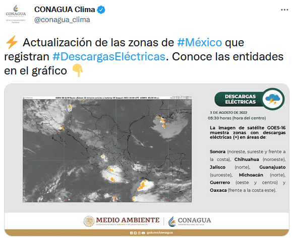 El Sistema Metereológico Nacional (SMN) pronosticó para este miércoles 03 de agosto lluvias muy fuertes para Jalisco, con lo que las lluvias continuarán.Para Jalisco se prevé un cielo medio nublado por la mañana con bancos de niebla en zonas serranas. Por la tarde, cielo nublado con lluvias puntales muy fuertes en Nayarit y Jalisco, así como fuertes en Michoacán y Colima, todas con descargas eléctricas y posible caída de granizo.Además, habrá ambiente fresco a templado por la mañana y cálido por la tarde, y caluroso en zonas costeras. El viento de componente oeste de 10 a 25 km/h con rachas de 40 a 50 km/h en zonas de tormenta.Para este martes, la presencia del monzón mexicano en el noroeste de México y el paso de la Onda Tropical Número 18 por el centro del territorio nacional, ocasionará lluvias muy fuertes en Aguascalientes, Durango, Guanajuato, Jalisco, Nayarit, Sinaloa y Zacatecas.El SMN, de la Comisión Nacional del Agua, también pronosticó lluvias fuertes en Campeche, Chiapas, Chihuahua, Ciudad de México, Colima, Estado de México, Guerrero, Michoacán, Puebla, Oaxaca, Sonora, Veracruz y Yucatán; chubascos en Querétaro y Quintana Roo, y lluvias aisladas (de 0.1 a 5 mm) en Baja California, Baja California Sur, Coahuila, Hidalgo, Morelos, Nuevo León, San Luis Potosí, Tabasco Tamaulipas y Tlaxcala.Hacia la tarde, el ambiente será de cálido a caluroso, con temperaturas de 40 a 45 grados Celsius en Baja California, Campeche, Chihuahua, Coahuila, Nuevo León, Sonora y Tamaulipas; de 35 a 40 grados en Baja California Sur, Chiapas, Colima, Durango, Guerrero, Jalisco, Michoacán, Nayarit, Oaxaca, Quintana Roo, San Luis Potosí, Sinaloa, Tabasco, Veracruz, Yucatán y Zacatecas, y de 30 a 35 grados Celsius en el norte de Hidalgo, el sur de Morelos, el suroeste de Puebla y el norte de Querétaro.OA