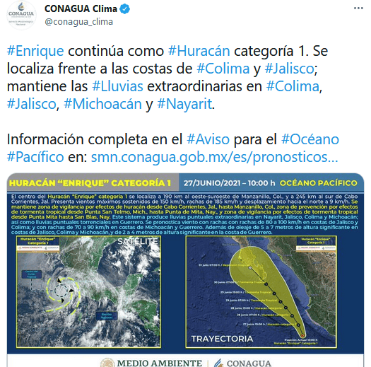El huracán "Enrique" se mantuvo en categoría 1, pero se intensificará en la próximas horas frente a las costas del estado de Jalisco, en el Pacífico mexicano, informó este domingo el Servicio Meteorológico Nacional (SMN).Agregó que entre la tarde de este día y la primeras horas del lunes, su centro registrará su máxima cercanía a tierra, a unos 130 kilómetros de Jalisco."Se prevé que los vientos de "Enrique", huracán categoría 1 en la escala de Saffir-Simpson, continúen intensificándose en las próximas horas pudiendo alcanzar la categoría 2", apuntó el SMN en su más reciente reporte.El SMN señaló que "las bandas nubosas de este sistema producen lluvias intensas a puntuales extraordinarias sobre el occidente y sur del territorio mexicano".De acuerdo con los pronósticos, "Enrique" subirá a huracán categoría 2 sobre las 13.00 horas locales y más tarde regresará a categoría 1 y se prevé que así se mantenga durante el lunes.A las 07.00 horas de este domingo, la formación se ubicaba a 280 kilómetros al sur de Cabo Corrientes, en Jalisco, y a 695 km al sureste de Cabo San Lucas, en Baja California Sur.Se mueve hacia el norte a seis kilómetros por hora, con vientos sostenidos de 150 kilómetros por hora y rachas de 185 kilómetros por hora.El SMN señaló que en el pronóstico a 24 horas "se prevén lluvias puntuales extraordinarias en los estados de Nayarit, Jalisco, Colima y Michoacán".Además de lluvias puntuales torrenciales en Guerrero, las cuales podrían estar acompañadas de descargas eléctricas y fuertes vientos, además de incrementar los niveles de ríos y arroyos, deslaves e inundaciones en zonas bajas de terreno.También se prevé viento con rachas de 80 a 100 km/h en costas de Jalisco y Colima; y con rachas de 70 a 90 km/h en costas de Michoacán y Guerrero. Además de oleaje de cinco a siete metros de altura significante en costas de Jalisco, Colima y Michoacán, y de dos a cuatro metros de altura significante en la costa de Guerrero.Según su trayectoria se espera que el ciclón toque tierras mexicanas el 1 de julio, pero ya como depresión tropical en Baja California Sur.Las autoridades llamaron a la población a extremar precauciones en las zonas de los estados mencionados por lluvias, viento y oleaje (incluyendo la navegación marítima) y atender las recomendaciones emitidas por las autoridades de Protección Civil."Enrique" es el quinto ciclón que se forma en la actual temporada de huracanes en el Pacífico mexicano tras "Andrés", "Blanca", "Carlos" y "Dolores".Las autoridades de México han pronosticado hasta 39 ciclones con nombre para 2021, con un máximo de 20 en el Pacífico y de 19 en el Atlántico, por lo que la temporada estará de nuevo por encima del promedio.GC