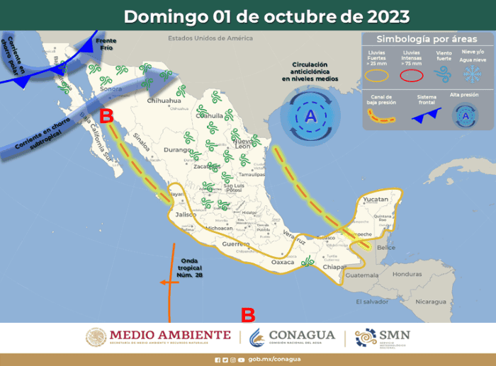 Mañana inicia el mes de octubre y Guadalajara espera intervalos nubosos a muy nubosos durante la tarde, según indica el portal Meteored.com. El mismo sitio indica que se esperan temperaturas mínimas de 16 a 17 grados y máximas de 30 a 31.Indican que a lo largo del día prevalecerá el viento moderado del oeste, con rachas que podrían llegar hasta los 33 km/h durante la tarde.En su pronóstico para 96 horas, el Servicio Meteorológico Nacional (SMN), dependencia de la Comisión Nacional del Agua (Conagua), indica que para este domingo 1 de octubre un canal de baja presión extendido sobre el occidente del Golfo de México y el sureste del país, una línea seca en el norte del país, inestabilidad en niveles altos de la atmósfera y el ingreso de humedad del Océano Pacífico, Golfo de México y Mar Caribe, generarán probabilidad de chubascos y lluvias fuertes a muy fuertes en el norte, noreste, oriente, centro occidente, sur y sureste del territorio nacional.También indica que un frente frío se aproximará e ingresará a la Península de Baja California y el noroeste de México, asociado con las corrientes en chorro polar y subtropical, originará descenso de temperatura, lluvias aisladas y vientos fuertes con tolvaneras en dichas regiones.----------OF