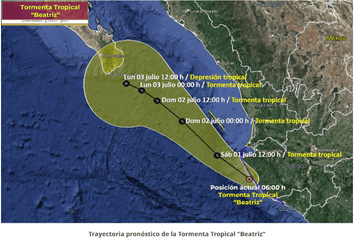 "Beatriz" ya no es huracán, ahora es una tormenta tropical, pero sus efectos, debido a su cercanía con el estado de Jalisco, seguirán sintiéndose este sábado 1 de julio.El centro de la tormenta tropical "Beatriz" se localiza muy cerca de la costa de Jalisco y mantendrá su desplazamiento paralelo a la costa de dicho estado. Sus bandas nubosas originarán lluvias puntuales intensas en el occidente del territorio nacional. Dichas lluvias podrían incrementar los niveles de ríos y arroyos, así como provocar deslaves e inundaciones en zonas bajas. Además de vientos y oleaje elevado en costas del centro del Pacífico mexicano.A las 06:00 horas, tiempo del centro de México, el centro de "Beatriz", ahora como tormenta tropical, se ubicaba a 40 kilómetros (km) al noroeste de Playa Pérula, y a 75 km al sur-sureste de Cabo Corrientes, Jalisco. Tiene vientos máximos sostenidos de 95 km/h, rachas de 120 km/h y se desplaza hacia el noroeste a 20 km/h.El Servicio Meteorológico Nacional (SMN), de la Comisión Nacional del Agua (Conagua), en coordinación con el Centro Nacional de Huracanes de Miami, mantiene zona de prevención por efecto de tormenta tropical desde Manzanillo, Colima, hasta Punta Mita, Nayarit, y zona de vigilancia por efectos de tormenta tropical desde Punta Mita hasta San Blas, ambos en Nayarit, así como en las Islas Marías.Con información del Servicio Meteorológico NacionalOA