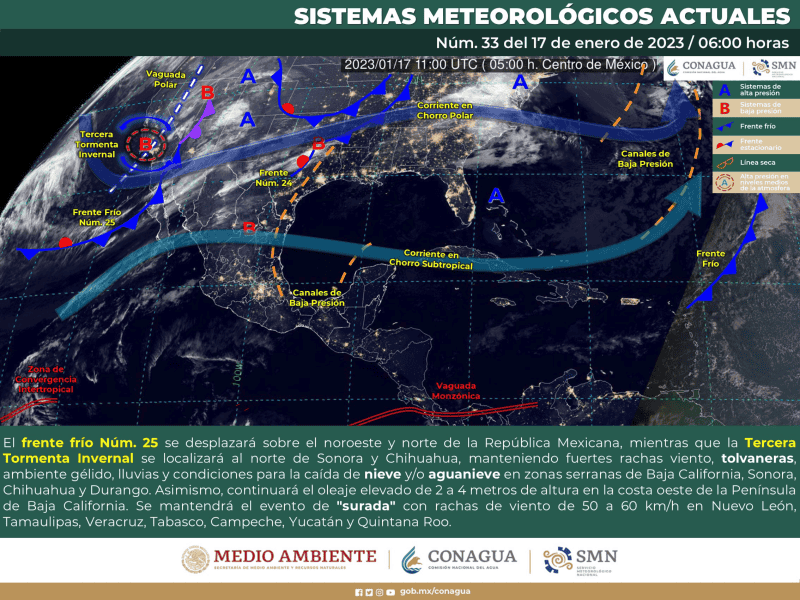 Hoy martes 17 de enero el clima frío sorprendió a los habitantes de la Zona Metropolitana de Guadalajara (ZMG), pues los registros de los termómetros rondaban alrededor de los 4 o 5 grados, sobre todo en zonas cercanas a la periferia, y de inmediato, las redes sociales se inundaron con preguntas sobre el estado del tiempo. Esto es lo que explica la Comisión Nacional del Agua (Conagua) a través del pronóstico del tiempo que difunde por medio del Servicio Meteorológico Nacional (SMN).Para este martes, el frente frío 25 se desplazará sobre el noroeste y norte de México, mientras que la Tercera Tormenta Invernal se localizará al norte de Sonora y Chihuahua, manteniendo fuertes rachas viento, tolvaneras, ambiente gélido, lluvias y condiciones para la caída de nieve y/o aguanieve en zonas serranas de Baja California, Sonora, Chihuahua y Durango. Asimismo, continuará el oleaje elevado de dos a cuatro metros de altura en la costa oeste de la Península de Baja California. Por otra parte, se mantendrá el evento de "surada" con rachas de viento de 50 a 60 km/h en Nuevo León, Tamaulipas, Veracruz, Tabasco, Campeche, Yucatán y Quintana Roo. Para la zona del Pacífico Centro, donde se ubica el Estado de Jalisco y Guadalajara, se espera cielo parcialmente nublado durante el día y sin lluvia, debido a la presencia de los mencionados fenómenos. Durante la mañana se prevé ambiente fresco, además de frío con posibles heladas en sierras de la Entidad, así como en Michoacán. Por la tarde, el ambiente será templado a cálido, y caluroso en zonas costeras.Se pronostica ambiente frío durante la noche y muy frío al amanecer, con temperaturas mínimas de -5 a 0 grados Celsius, sobre todo en las regiones Norte y Altos norte.OF
