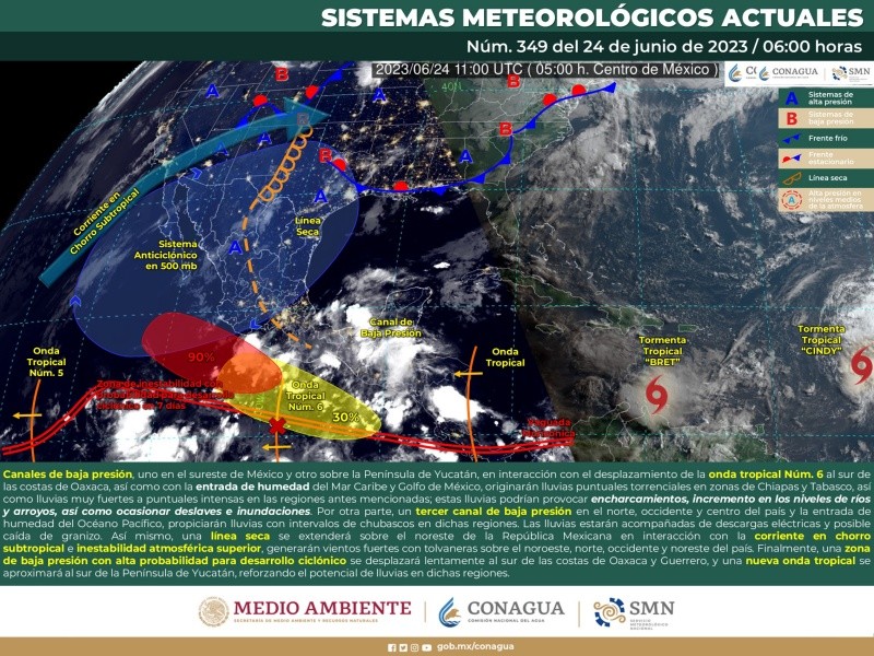 De acuerdo con el Servicio Meteorológico Nacional (SMN), este día, dos canales de baja presión, uno en el sureste de México y otro sobre la Península de Yucatán, en interacción con el desplazamiento de la onda tropical número 6 al sur de las costas de Oaxaca, así como con la entrada de humedad del Mar Caribe y Golfo de México, originarán lluvias puntuales torrenciales en zonas de Chiapas y Tabasco, así como lluvias muy fuertes a puntuales intensas en las regiones antes mencionadas.Por otra parte, un tercer canal de baja presión en el norte, occidente y centro del país y la entrada de humedad del Océano Pacífico, propiciarán lluvias con intervalos de chubascos en dichas regiones.Un tercer fenómeno, una línea seca, se extenderá sobre el noreste de la República Mexicana en interacción con la corriente en chorro subtropical e inestabilidad atmosférica superior, generarán vientos fuertes con tolvaneras sobre el noroeste, norte, occidente y noreste del país.Finalmente, una zona de baja presión con alta probabilidad para desarrollo ciclónico se desplazará lentamente al sur de las costas de Oaxaca y Guerrero, y una nueva onda tropical se aproximará al sur de la Península de Yucatán, reforzando el potencial de lluvias en dichas regiones.Según el reporte de la dependencia de la Conagua, para la zona del Pacífico Centro, donde se ubica Jalisco, a lo largo del día se pronostican chubascos, descargas eléctricas y posible caída de granizo en Michoacán, además de lluvias aisladas en Nayarit, esta Entidad y Colima. Ambiente fresco durante la mañana y caluroso a muy caluroso por la tarde. Viento de dirección variable de 15 a 30 km/h, y rachas de 40 a 60 km/h con posibles tolvaneras en Jalisco y Michoacán.OF