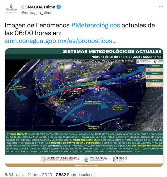Para este sábado 21 de enero el Frente Frío Número 25 se mantendrá estacionario sobre el noreste del Golfo de México, pero con la entrada de humedad del Golfo de México y Mar Caribe propiciará chubascos en Tamaulipas, San Luis Potosí, Veracruz y Chiapas, además de lluvias aisladas en Hidalgo, Puebla, Oaxaca y Quintana Roo.Por otra parte, el Frente Frío Número 26 se desplazará por el norte y en interacción con las corrientes en chorro polar y subtropical, ocasionará tolvaneras y lluvias aisladas en Coahuila y Nuevo León.Mientras tanto una circulación anticiclónica en niveles medios de la atmósfera generará condiciones estables y menos frío en el resto del país. Con ambiente vespertino cálido a caluroso sobre los estados costeros y sobre la Península de Yucatán.En su pronóstico por regiones, el Servicio Meteorológico Nacional (SMN), dependencia de la Comisión Nacional del Agua (Conagua) indica que para el clima de la zona del Pacífico Centro, donde se ubican Jalisco y Guadalajara, esperan cielo despejado, bancos de niebla matutinos en zonas altas y ambiente muy frío con heladas en sierras de la Entidad. En la tarde se prevé ambiente cálido y viento del suroeste de 10 a 25 km/h, con rachas de hasta 60 km/h y tolvaneras en algunas zonas de Jalisco.***OF