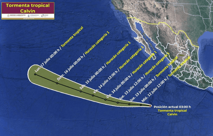 Durante el transcurso del día de hoy se espera que la Depresión Tropical Tres-E suba de nivel y se transforme en la Tormenta Tropical "Calvin", en su paso por el Océano Pacífico; de seguir así para mañana jueves podría volverse un huracán nivel 1, pero de momento su trayectoria nos indica que cada vez se aleja más de las costas mexicanas. Acá te mostramos su trayectoria.La Depresión Ttropical Tres-E se formó cerca las 15:00 horas del martes frente a las costas de Jalisco, la misma ha provocado lluvias en la Entidad y en Guerrero, además de un ligero impacto en Michoacán, Colima y Baja California. De acuerdo con la Comisión Nacional del Agua Conagua), por medio del Servicio Meteorológico Nacional (SMN), se espera que la depresión evolucione de forma paulatina en la tormenta tropical "Calvin" durante todo el 12 de junio y conforme pasan los días ya debería tener la fuerza y velocidad para ser considerado un huracán categoría 1.No obstante, sus días por el país están contados, pues durante su trayectoria por el Océano Pacífico se espera que se aleje de las costas nacionales para antes de que sea considerado huracán, por lo que no habrá lluvias, vientos, mareas u otras consecuencias durante el fin de semana.Por otro lado, se pronostica que los canales de baja presión sobre México, la entrada de humedad y la llegada de la onda tropical número 12 desde el sureste, específicamente Yucatán, ocasionen lluvias fuertes y puntuales en Chiapas, Chihuahua, Oaxaca, Quintana Roo, Sinaloa y Yucatán; de fuertes a moderadas en Campeche, Ciudad de México, Estado de México, Durango, Guanajuato, Morelos, Puebla, Sonora, Tlaxcala, Veracruz y Zacatecas; lloviznas en Aguascalientes, Coahuila, Hidalgo, Nuevo León, Querétaro, San Luis Potosí y Tabasco, y lluvias aisladas en Tamaulipas.Las lluvias podrían estar acompañadas de caída de rayos, fuertes vientos y granizadas. Debido a la caída pluvial, advierte Conagua que podría incrementar el nivel del agua en ríos y arroyos, así como inundaciones o deslaves, por lo que es importante que se acaten las indicaciones de Protección Civil local.Durante el temporal de lluvias se espera que del lado del Pacífico se presenten entre 16 y 22 ciclones tropicales, entre ellos, de 9 a 11 tormentas tropicales, de 4 a 6 huracanes categoría 1 y 2, y de 3 a 5 huracanes categoría 3, 4 y 5. Como es de esperarse, los fenómenos más severos se presentarán casi al final de la temporada y en caso de que quieras seguir su trayectoria de cerca y en vivo puedes usar el radar de la página Windy en este enlace: https://www.windy.com/es/-Seg-de-huracanes/hurricanes/94l?22.877,-114.582,3OA