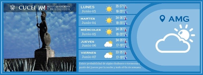 Para este viernes 7 de junio continúa el ambiente cálido en la Zona Metropolitana de Guadalajara, puesto que por la mañana se esperan principalmente cielos despejados en la entidad.Sin embargo, toma en cuenta que para la tarde de este viernes se esperan cielos nubosos con chubascos tormentosos, de acuerdo con el sitio especializado en información meteorológica, Meteored.Es decir, hay un 40 por ciento de probabilidad de que se presente una lluvia débil con cielo parcialmente nublado alrededor de las cinco de la tarde en adelante. Además, para este 7 de junio las temperaturas oscilarán entre los 33°C y 35°C durante el día, según el Instituto de Astronomía y Meteorología de la UdeG. De acuerdo con el reporte del El Sistema Meteorológico Nacional (SMN) estas son los estados en donde se podrían presentar lluvias este viernes. NA