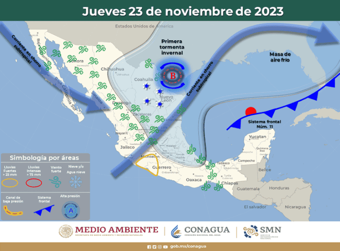 El frente frío núm. 11 y la masa de aire polar asociada a él generarán el descenso de temperaturas en gran parte del país. Por otro lado, la primera tormenta invernal propiciará las condiciones para la caída de aguanieve o nieve en zonas de México, de acuerdo al pronóstico elaborado por el Servicio Meteorológico Nacional (SMN), fuente climática oficial del Gobierno de México.Dichas condiciones favorecerá que en el Área Metropolitana de Guadalajara se presenten días muy fríos lo que resta de la semana, incrementando los primeros días de la siguiente, aunque aún seguirán bajas. Aquí más detalles sobre el clima que está por venir.Por ahora, el pronóstico indica que desde mañana y hasta el sábado los termómetros podrían bajar hasta 8 °C en la ciudad.El frente Núm. 11 comenzará a adquirir características de estacionario desde el centro del Golfo de México hasta el sureste del territorio nacional, y en combinación con el ingreso de humedad del Mar Caribe y un canal de baja presión al sur del Golfo de México, propiciará chubascos en Oaxaca, Chiapas, Veracruz, Tabasco y en la Península de Yucatán.Por su parte, la masa de aire frío asociada al frente empezará a modificar sus características térmicas, favoreciendo un ascenso gradual de las temperaturas en la Mesa del Norte y la Mesa Central, así como una disminución en la probabilidad de lluvias sobre la mayor parte del territorio nacional, no obstante, sobre el noreste, oriente y centro del país, durante la noche el ambiente seguirá siendo frío a muy frío con heladas al amanecer en zonas altas de dichas regiones; además, provocará viento de componente norte con rachas de 50 a 70 km/h en el Istmo de Tehuantepec, y con oleaje elevado de 1 a 3 metros de altura en las costas de Veracruz, Tabasco y Golfo de Tehuantepec.Finalmente, la primera tormenta invernal comenzará a desplazarse sobre el sur y sureste de Estados Unidos, dejando de afectar el territorio mexicano.El frente Núm. 11 se mantendrá como estacionario sobre el centro del Golfo de México y el sureste del país, y aunado al ingreso de humedad de ambos litorales, ocasionará lluvias y chubascos en el sureste y la Península de Yucatán.La masa de aire frío asociada al frente seguirá modificando sus características térmicas, provocando un incremento de las temperaturas diurnas y baja probabilidad de lluvias en gran parte del territorio nacional, pero aún continuará el ambiente nocturno frío a muy frío en entidades del centro y oriente del país, así como viento de componente norte de 50 a 70 km/h en la costa sur de Veracruz e Istmo y Golfo de Tehuantepec.Además, un nuevo sistema frontal se aproximará a la frontera norte de México y se asociará con la corriente en chorro subtropical, e interactuará con canales de baja presión sobre el norte y noreste de la República Mexicana, ocasionando fuertes rachas de viento en ambas regiones.Con información del Servicio Meteorológico Nacional, Instituto de Astronomía y Meteorología y The Weather Channel* * * Mantente al día con las noticias, únete a nuestro canal de WhatsApp * * *OA