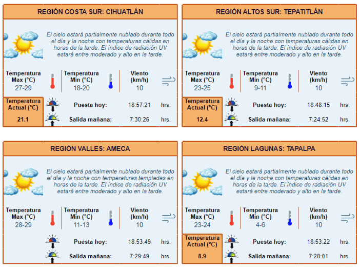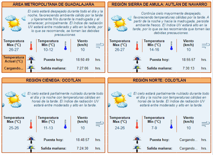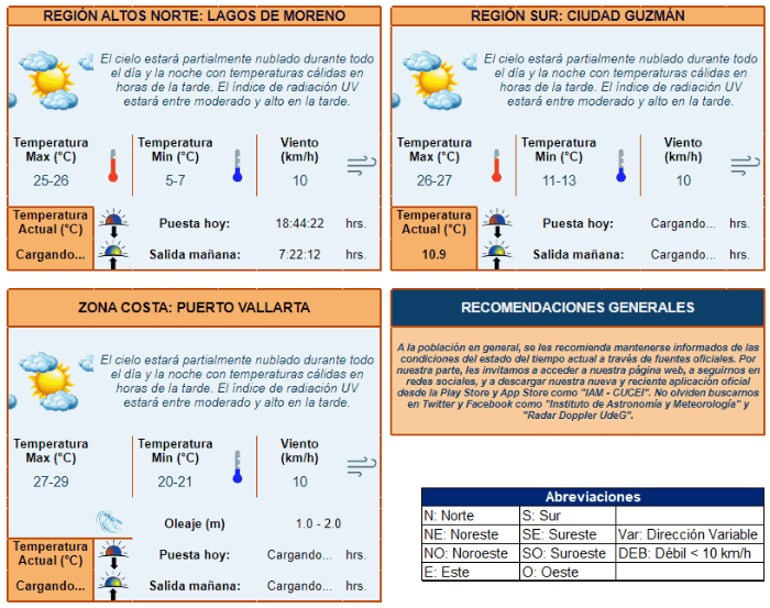 El Servicio Meteorológico Nacional, pronostica para este domingo lluvias aisladas y bancos de niebla en las regiones de Jalisco. Por su parte, el Instituto de Astronomía y Meteorología de la Universidad de Guadalajara en su pronóstico diario, señala que las corrientes en chorro polar y subtropical en combinación con un sistema frontal en el noreste de méxico siguen provocando algunas precipitaciones en algunos estados. Por otra parte, un sistema anticiclónico continúa afectando el centro y sur del país con temperaturas cálidas por la tarde, sin probabilidad de lluvias, y temperaturas frías hacia el amanecer.En Jalisco, la nubosidad variable permanecerá durante el día, con temperaturas gradablemente cálidas en horas de la tarde y algo frías al amanecer. *Mantente al día con las noticias, únete a nuestro canal de WhatsApp aquí: https://whatsapp.com/channel/0029VaAf9Pu9hXF1EJ561i03 MV