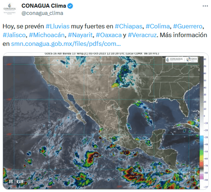 La tormenta tropical "Lidia" se formó este martes 3 de octubre en el Océano Pacífico y será huracán, según el pronóstico del Servicio Meteorológico Nacional (SMN), fuente climática oficial del Gobierno de México, que también señaló que se ubicará frente a las costas de Jalisco, lo que traerá lluvias para la Entidad.Para este día se pronostican lluvias muy fuertes (de 50 a 75 milímetros [mm]) Chiapas, Colima, Guerrero, Jalisco, Michoacán, Nayarit, Oaxaca y Veracruz; fuertes (de 25 a 50 mm) en Ciudad de México Coahuila, Durango, Estado de México, Guanajuato, Morelos, Puebla y Sinaloa; intervalos de chubascos (de 5 a 25 mm) en Aguascalientes, Campeche, Chihuahua, Hidalgo, Nuevo León, Querétaro, Quintana Roo, San Luis Potosí, Tabasco, Tamaulipas, Tlaxcala, Yucatán y Zacatecas, y lluvias aisladas (de 0.1 a 5 mm) en Baja California Sur.Las precipitaciones mencionadas serán generadas por la tormenta tropical "Lidia", originada al suroeste de las costas de Colima y Jalisco; la presencia del sistema frontal número 4, que se extenderá sobre la frontera norte de México, en interacción con una línea seca sobre Coahuila; canales de baja presión extendidos a lo largo de la Sierra Madre Occidental y el sureste del país, en combinación con ingreso de humedad del Océano Pacífico, Golfo de México y Mar Caribe, y por inestabilidad en niveles altos de la atmósfera.Se espera que las lluvias de fuertes a muy fuertes estén acompañadas de descargas eléctricas, rachas fuertes de viento y posible caída de granizo; podrían ocasionar encharcamientos, además del incremento en los niveles de ríos y arroyos, así como deslaves e inundaciones en zonas bajas, por lo que se recomienda a la población de los estados afectados atender las indicaciones de Protección Civil.A las 03:00 horas, tiempo del Centro de México, se formó la tormenta tropical "Lidia" al sur de las costas de Colima y Michoacán; se localizó a 815 kilómetros (km) al sur-suroeste de Punta San Telmo, Michoacán y a 850 km al sur-suroeste de Manzanillo, Colima. Presenta vientos sostenidos de 65 kilómetros por hora (km/h), con rachas de 85 km/h y se desplaza hacia el oeste-noroeste a 15 km/h.Para Jalisco, el día de hoy se prevén tormentas dispersas al final de la tarde en gran parte del estado, con excepción de las regiones norte y altos.Con información del Servicio Meteorológico Nacional e Instituto de Astronomía y MeteorologíaOA