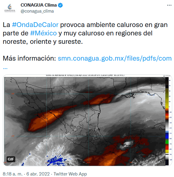 La Comisión Nacional del Agua (Conagua) informó que este miércoles, la onda de calor mantendrá ambiente vespertino caluroso sobre la mayor parte del país, y muy caluroso en regiones del noreste, oriente, sureste de México, además de la Península de Yucatán.Se pronostican temperaturas máximas de 40 a 45 grados Celsius en Campeche, noroeste de Guerrero, norte de Hidalgo, centro y sur de Michoacán, Morelos, este de Nuevo León, el norte de Oaxaca, Puebla y Querétaro, el este de San Luis Potosí, el este y centro de Tabasco, en Tamaulipas, norte y sur de Veracruz y Yucatán.También, se esperan valores de 35 a 40 grados Celsius en el norte de Baja California, Chiapas, Colima, el suroeste del Estado de México, noreste de Guanajuato, sur de Jalisco, en Nayarit, Quintana Roo, norte de Sinaloa y el noroeste, centro y sur de Sonora, y de 30 a 35 grados Celsius en Aguascalientes, centro de Baja California Sur, el este de Chihuahua y Coahuila, en la Ciudad de México, noreste de Durango, Tlaxcala y el sur de Zacatecas.Debido a las altas temperaturas que se pronostican para este miércoles, se recomienda a la población evitar la exposición prolongada a la radiación del sol, hidratarse adecuadamente, poner especial atención a enfermos crónicos, niños y adultos mayores, así como atender las indicaciones de las autoridades del sector salud y de Protección Civil de su localidad.Se pronostica viento con rachas de 70 a 80 kilómetros por hora (km/h) y tolvaneras en Coahuila y Nuevo León y rachas de 60 a 70 km/h con tolvaneras en Baja California, Chihuahua, San Luis Potosí y Zacatecas, así como viento de componente sur con rachas de 60 a 70 km/h en el Istmo de Tehuantepec, y con rachas de 50 a 60 km/h en Campeche, Quintana Roo, Tabasco, sur de Veracruz y Yucatán.Se estima viento con rachas de 50 a 60 km/h en Aguascalientes, Durango, Hidalgo, Jalisco, Querétaro, Sonora y el Golfo de Tehuantepec. Se espera evento de Norte con rachas de 50 a 60 km/h en Tamaulipas y norte de Veracruz, a partir de esta noche y la madrugada del jueves.Se prevén lluvias puntuales fuertes (de 25 a 50 milímetros [mm]) en sitios de Chiapas, así como lluvias aisladas (de 0.1 a 5 mm) en zonas de Oaxaca, Tabasco y Veracruz.Las condiciones meteorológicas antes mencionadas serán originadas por el Frente Frío Número 41 y su masa de aire frío asociada, que ingresarán en el norte de México e interaccionarán con un canal de baja presión sobre Nuevo León y Tamaulipas y la corriente en chorro subtropical, además del ingreso de humedad del Océano Pacífico.La Secretaría de Gestión Integral de Riesgos y Protección Civil informó que este miércoles se mantendrá el ambiente muy caluroso, con cielo medio nublado y altos índices de radiación Ultravioleta.Se recomienda no exponerse a los rayos directos del sol y dar seguimiento a la alerta amarilla por altas temperaturas.En el transcurso del día dominará cielo con nubes dispersas, sin lluvia en la Ciudad de México y el Estado de México.Viento de componente sur de 5 a 15 km/h con rachas de hasta 40 km/h.En la Ciudad de México se pronostica una temperatura mínima de 13 a 15°C y una máxima de 29 a 31°C.Para la capital del Estado de México, temperatura mínima de 2 a 4°C y máxima de 24 a 26°C.OA