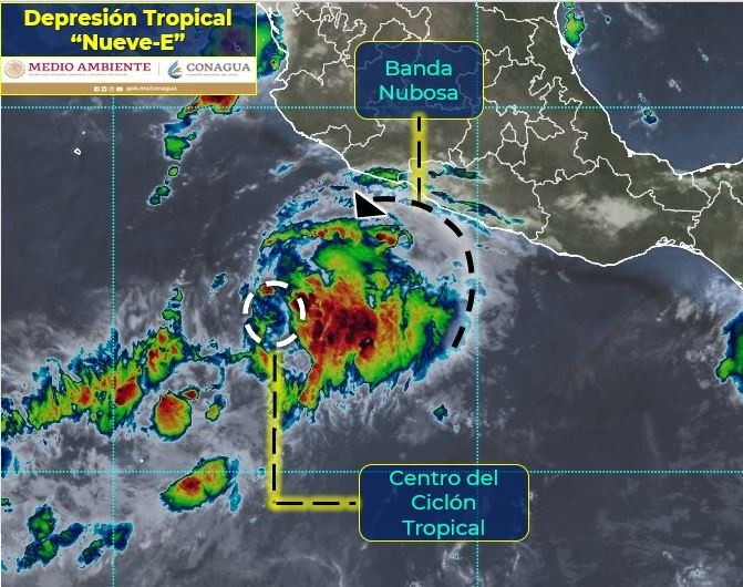 El Servicio Meteorológico Nacional (SMN) informó en su aviso de las 10:15 horas que se formó la Depresión Tropical "Nueve-E" al sur de las costas de Jalisco y Colima, situación que favorecerá más lluvias.El SMN indica que el fenómeno se desplaza hacia el noroeste de forma paralela a las costas del Pacífico Mexicano.Al momento del comunicado, el sistema se encontraba a 545 km al sur-suroeste de Manzanillo, Colima, y a 585 km al sur de Playa Pérula, Jalisco, y se desplazaba hacia el noroeste a 20 km/h, con vientos sostenidos de 55 km/h y rachas de hasta 75 km/h.Según la dependencia de la Conagua, la amplia circulación de la depresión tropical "Nueve-E" reforzará la probabilidad de lluvias puntuales muy fuertes (de 50 a 75 mm) en Jalisco, Colima, Michoacán y Guerrero.El sistema producirá vientos de 50 a 60 km/h y oleaje de 1.5 a 2.5 metros de altura en las costas de los estados antes mencionados.Autoridades piden extremar precauciones a la población en general en las zonas de los estados mencionados por lluvias, viento y oleaje (incluyendo la navegación marítima) y atender las recomendaciones emitidas por las autoridades del Sistema Nacional de Protección Civil, en cada entidad.OF