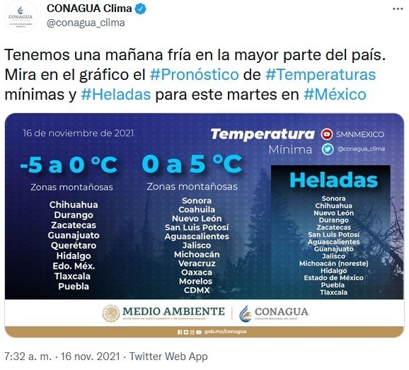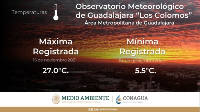El ambiente frío predomina en la mayor parte de México y Guadalajara también registra un descenso en la temperatura. La Comisión Nacional del Agua (Conagua) informó que el termómetro en Guadalajara marcó una mínima de 5.5 grados al amanecer de este martes, registrado en el Observatorio metereológico de Los Colomos.En Jalisco, la menor temperatura registrada esta mañana fue de -2.5 grados en San Gaspar de los Reyes, en Jalostotitlán.La masa de aire que generó al frente frío 8 provoca ambiente frío con heladas al amanecer en zonas del norte, noreste, centro y oriente de México, dijo hoy el Servicio Metereológico Nacional (SMN).En partes altas de Jalisco se prevén mínimas de 0 a 5 grados así como heladas.IM