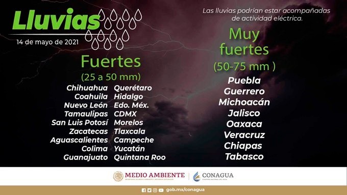 El Servicio Meteorológico Nacional (SMN) pronostica para la Zona Metropolitana de Guadalajara (ZMG) y el Centro del estado temperaturas calurosas, con máximas que irán de los 32 a los 34 grados, este viernes 14 de mayo.De igual manera se prevén lluvias con intervalos de chubascos; así como temperaturas mínimas entre los 16 y 18 grados.Por su parte el Instituto de Astronomía y Meteorología (IAM) de la Universidad de Guadalajara señaló que hay probabilidad de lluvia aislada en el transcurso de esta tarde; estas condiciones persistirán durante el sábado por lo que se recomienda tomar precauciones.También mencionó que se espera un ligero incremento en las temperaturas para el fin de semana, por lo que ante el ambiente caluroso se exhorta a tomar abundantes líquidos, vestir con colores claros y utilizar filtro solar.El SMN indicó que para el estado se prevé cielo medio nublado en la mañana, nublado desde la tarde en gran parte del territorio con chubascos y lluvias puntuales fuertes, actividad eléctrica asociada y posible caída de granizo en las regiones serranas y Sur de la entidad.El ambiente será caluroso a muy caluroso durante el día, templado por la noche y fresco al amanecer. Las temperaturas máximas irán de los 35 a los 40 grados en algunas zonas del estado.En la región Norte de Jalisco se esperan lluvias aisladas, las temperaturas máximas estarán entre los 33 y 35 grados, las mínimas entre los 15 a los 17 grados; mientras que en la región Costa se prevén máximas entre los 30 a los 32 grados y mínimas entre los 22 a 24 grados, así como chubascos con lluvias puntuales fuertes.NR