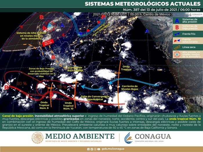 Para este martes 13 de julio, el Servicio Meteorológico Nacional (SMN) alertó que debido a un canal de baja presión, extendido a lo largo de la Sierra Madre Occidental, en algunas zonas del país, incluido Jalisco, habrá probabilidad de lluvias fuertes a muy fuertes, con descargas eléctricas y posibles granizadas.El organismo señaló que hoy martes, en las regiones Altos Norte, Altos Sur Norte y Sierra Occidental, se espera cielo nublado con lluvias puntuales muy fuertes, mientras que para el resto de Jalisco habrá chubascos a intervalos con lluvias puntuales fuertes, acompañadas de actividad eléctrica y posible caída de granizo.Se prevé que las precipitaciones inicien por la tarde y noche de hoy, aunque podrían continuar por la madrugada y primeras horas de la mañana. Se esperan temperaturas máximas de 30 y 35 grados.El Instituto de Astronomía y Meteorología de la UdeG pronostica que para este martes para la Zona Metropolitana de Guadalajara (ZMG) habrá cielo con nubes dispersas, mayormente nublado, con probabilidad de lluvia con actividad eléctrica al final de la tarde y el anochecer.La temperatura máxima para la ZMG es de 26 grados, mientras que la mínima es de 17 grados.