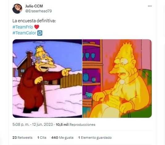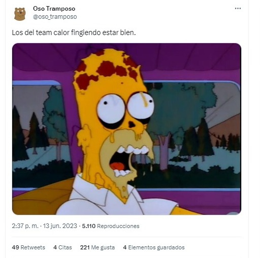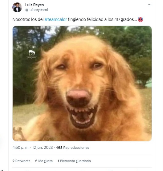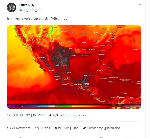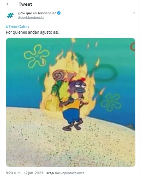 El calor sigue imparable en la Zona Metropolitana de Guadalajara y este día martes logró un nuevo récord histórico al llegar a 37.9 grados Celsius.Ante esta situación, es que los cibernautas no desaprovecharon el momento para tomarlo con humor y hacer memes de quienes prefieren el calor, incluso, hicieron tendendencia el #TeamCalor.Cabe recordar que debido a la tercera ola de calor que azota en el país, e incluso, se esperan temperaturas en algunos estados de 45 grados celsius.No olvides para evitar un golpe de calor mantenerse hidratados, de preferencia con agua natural, y evitar los lugares concurridos donde se concentre el calor. El sábado 17 de junio se espera cielo parcialmente cubierto, probabilidad de tormenta.