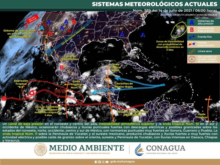 Asimismo, la onda tropical número 11 se desplazará sobre la Península de Yucatán, se combinará con ingreso de humedad proveniente del Golfo de México, lo que ocasionará chubasco y lluvias fuertes sobre el oriente y sureste del país.