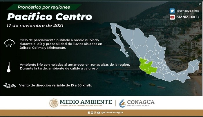 El frío no se detiene y para este miércoles el pronóstico es que afectará al amanecer en zonas altas del norte, noreste, centro y oriente con bancos de niebla en zonas del sureste de México.Además, el Servicio Meteorológico Nacional prevé que los canales de baja presión sobre el sureste del territorio nacional y la entrada de humedad del Golfo de México y Mar Caribe, propiciarán lluvias puntuales fuertes en Yucatán y Quintana Roo, así como chubascos en el sureste del país.Asimismo, una línea seca se mantendrá sobre el norte del país y un canal de baja presión sobre el noroeste de México, originarán viento con rachas de 60 a 70 km/h y tolvaneras en Chihuahua.Al final de día, se pronostica el ingreso de un nuevo frente frío sobre el norte del país. La masa de aire frío que lo impulsa, producirá vientos con rachas de 50 a 60 km/h en Coahuila, Nuevo León y Tamaulipas, así como descenso de temperatura con heladas en zonas altas del norte y noreste del país durante la madrugada del jueves.Yucatán y Quintana Roo.Baja California Sur, Sonora, Coahuila, Nuevo León, Tamaulipas, Sinaloa, Nayarit, Campeche, Yucatán y Quintana Roo, así como en las costas de Jalisco, Colima, Michoacán, Guerrero, Oaxaca y Chiapas.Temperaturas mínimas de -5 a 0 °C con heladas: zonas montañosas de Sonora, Chihuahua, Durango, Zacatecas, Hidalgo, Michoacán, Estado de México, Tlaxcala, Puebla y Veracruz.Temperaturas mínimas de 0 a 5 °C con heladas: zonas montañosas de Baja California, Coahuila, Nuevo León, Tamaulipas, San Luis Potosí, Aguascalientes, Jalisco, Guanajuato, Querétaro, Oaxaca, Ciudad de México y Morelos.