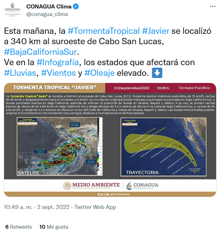 La tormenta tropical "Javier" traerá lluvias muy fuertes para algunas zonas del estado de Jalisco este viernes 2 de septiembre, informó la Comisión Nacional del Agua (Conagua) en su boletín diario.La dependencia detalló que "Javier" se encuentra en el Océano Pacífico, a 380 kilómetros al sur-suroeste de Cabo San Lucas, Baja California Sur, entidad donde también hay pronóstico de precipitaciones de lluvias muy fuertes e intensas y se espera oleaje de hasta cuatro metros de altura.De acuerdo con el Sistema Meteorológico Nacional de Conagua, también habrá lluvias fuertes a muy fuertes en Durango, Nayarit y Sinaloa.Además, habrá rachas fuertes de viento de 60 a 70 km/h en Baja California Sur, rachas de 50 a 60 km/h en el sur del Golfo de California y costas de Sinaloa, Nayarit y Jalisco, además de oleaje elevado de 2 a 4 metros de altura en la costa de Baja California Sur, y de 1 a 3 metros de altura en el sur del Golfo de California y costas de Sinaloa, Nayarit y Jalisco.Por último, las autoridades solicitaron extremar precauciones a la población en general en las zonas de los estados mencionados por lluvias, viento y oleaje (incluyendo la navegación marítima) y atender las recomendaciones emitidas por las autoridades del Sistema Nacional de Protección Civil, en cada entidad.GC