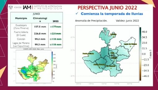 Un ligero incremento de la media histórica respecto a las lluvias en Jalisco, es lo que se espera para el próximo trimestre, informó este martes la meteoróloga del Instituto de Astronomía y Meteorología (IAM) de la Universidad de Guadalajara, Martha Diana Alcocer.Se prevé, estadísticamente, que la temporada de lluvias este 2022 inicie entre el 13 y el 17 de junio, y que si bien de enero a marzo se tuvieron lluvias por debajo del promedio histórico, se tiene contemplado que a partir de junio y hasta el mes de agosto los niveles sean ligeramente superiores.Por ejemplo, dijo, en Guadalajara se tiene previsto que en junio se tenga un incremento de entre 15 a 20 milímetros de lluvia respecto del promedio histórico, llegando a hasta 177mm, mientras que en julio se llegará a 258 mm, siendo este mes en el que más precipitaciones se prevén. Para agosto se estima que se tendrá un promedio de 203 mm de lluvia acumulada, al menos 2mm más que el promedio histórico.Donde podrían registrarse un aumento en las lluvias en este trimestre, sería en la zona de Puerto Vallarta, y donde habría menos lluvia sería en la zona de Lagos de Moreno.Todo lo mencionado, puntualizó la experta, sin considerar “fenómenos meteorológicos extremos”, como un ciclón, un huracán, lo cual cambiaría las perspectivas. “Es muy importante que estén al pendiente del pronóstico diario, ya que la ocurrencia de algún evento hidrometeorológico extremo se podría mencionar en el pronóstico diario, y puede ayudar para tomar las precauciones necesarias”, añadió.Los meses siguientes, señaló, están aún en incertidumbre debido a las variaciones que puede traer consigo el fenómeno de La Niña, en el cual nos encontramos actualmente.El director del IAM, Héctor Hugo Ulloa, recordó que estos datos solo detallan una previsión de pronóstico, a fin de que las autoridades y la ciudadanía establezcan las acciones debidas a manera de prevención, es decir, los datos presentados pueden presentar modificaciones según el avance del temporal. El investigador del IAM, Omar Faustino García, añadió por su parte que no es posible predecir la aparición o trayectoria más allá de cinco días de fenómenos meteorológicos como huracanes o ciclones. Por su parte, la Unidad Estatal de Protección Civil y Bomberos Jalisco (UEPCBJ), explicó que si bien existe la posibilidad de que en esta temporada puedan formarse entre 14 y 19 Ciclones Tropicales en el Océano Pacífico, se desconoce cuántos de ellos son los que pudieran llegar afectar a nuestro Estado, según estudios entregados por especialistas de la Comisión Nacional del Agua. "A pesar de que algunos modelos numéricos pueden alcanzar a dar indicios de formación de un ciclón con más de 10 días de anticipación, no se pude alarmar a la población con un período superior a los cinco días, debido al alto grado de incertidumbre que se presenta en estas modelaciones", detalló la UEPCBJ a través de un comunicado. GC
