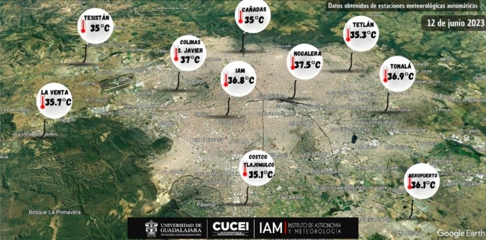 Debido a la tercera ola de calor que se registra en todo el país, se esperan temperaturas de incluso más de 45 grados centígrados en diferentes estados.La Comisión Nacional del Agua (Conagua) refirió que en Jalisco se prevé que también esta semana el calor siga incrementándose.Este lunes, la temperatura máxima registrada en la Zona Metropolitana de Guadalajara fue de 37. 5.De acuerdo con el Instituto de Astronomía y Meteorología (IAM), con datos obtenidos en las estaciones meteorológicas, obtuvo cuáles fueron las temperaturas hoy en distintas partes de la ciudad.