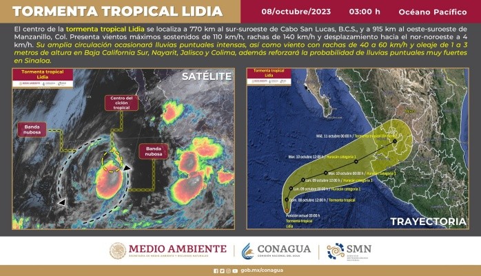 Esta madrugada la tormenta tropical “Lidia” se ubicó a 770 km al sur-suroeste de Cabo San Lucas, Baja California Sur. Sin embargo, su amplia circulación mantiene la probabilidad de lluvias muy fuertes a puntuales intensas en varios estados, incluido Jalisco.El Servicio Meteorológico Nacional, detalla que las lluvias puntuales intensas se presentarán este domingo en Baja California Sur, Nayarit, Jalisco y Colima. Además reforzará la probabilidad de lluvias puntuales muy fuertes en Sinaloa.Se prevé viento con rachas de 40 a 60 km/h y oleaje de 1 a 3 metros de altura en Baja California Sur, Nayarit, Jalisco y Colima. Se pide a la población de estos estados, extremar precauciones por lluvias, viento y oleaje (incluyendo la navegación marítima) y atender las recomendaciones emitidas por las autoridades del Sistema Nacional de Protección Civil, en cada entidad.MV