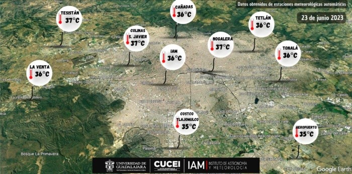 La tercera ola de calor se sigue sintiendo en Jalisco. Prácticamente todo el mes las temperaturas han rozado los 40 grados en la Zona Metropolitana de Guadalajara.Aunque se espera que la siguiente semana comiencen las lluvias en el Estado, este viernes todavía se sintió el calor en la ciudad.De acuerdo con el Instituto de Astronomía y Meteorología (IAM) de la Universidad de Guadalajara (UdeG), la temperatura más alta registrada hoy en las estaciones del instituto fue la de 37 grados celsius.