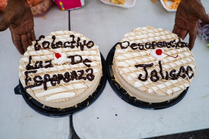 La verbena representó momentos de felicidad en medio del dolor de tener a uno o varios familiares desaparecidos: se partió un pastel y al grito de “¡Mordida!, ¡Mordida!”, los familiares embarraron de pastel a Liliana Meza y también a Héctor Flores, vocero del colectivo.