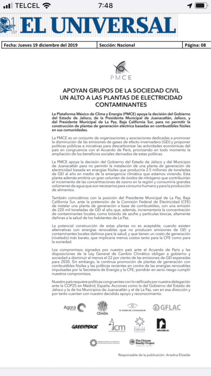 La Plataforma México de Clima y Energía (PMCE), que agrupa a organismos defensores del medio ambiente como Greenpeace y The Climate Reality Project, manifestó en un desplegado publicado este jueves su respaldo al gobernador Enrique Alfaro Ramírez por no permitir la construcción de la termoeléctrica "La Charrería", en Juanacatlán.“La PMCE apoya la decisión del Gobierno del Estado de Jalisco y del municipio de Juanacatlán para no permitir la instalación de una planta generadora de electricidad basada en energías fósiles que produciría 2.5 millones de toneladas de GEI al año en medio de la emergencia climática que estamos viviendo. Esta planta además emitiría un gran volumen de óxidos de nitrógeno que contribuirían al incremento de las concentraciones de ozono en la región y consumiría grandes volúmenes de agua que son necesarios para consumo humano y para la producción de alimentos”, se lee en la carta divulgada por un medio de comunicación nacional.“Los compromisos signados por nuestro país ante el Acuerdo de Paris y las disposiciones de la Ley General de Cambio Climático obligan a gobierno y sociedad a disminuir al menos el 22 por ciento de las emisiones de GEI esperadas para 2030. Sin embargo, la continua promoción de plantas de generación con combustibles fósiles y las políticas recientes en contra de las energías renovables impulsadas por la Secretaría de Energía y la CFE, pondrán en serio riesgo cumplir nuestros compromisos. Nuestro país requiere políticas congruentes con lo ratificado por nuestra delegación ante la COP25 en Madrid, España. Acciones como la del Gobierno del Estado de Jalisco y la de los Municipios de Juanacatlán y el de La Paz, van en esa dirección y por tanto cuentan con nuestro decidido apoyo y reconocimiento”, continúa el comunicado.Este martes el gobernador de Jalisco, Enrique Alfaro, anunció la cancelación del proyecto debido a que era inviable en materia medioambiental; “o estamos comprometidos con la agenda climática o no lo estamos; el Gobierno federal también debe asumir una posición al respecto”, comentó el mandatario.JM