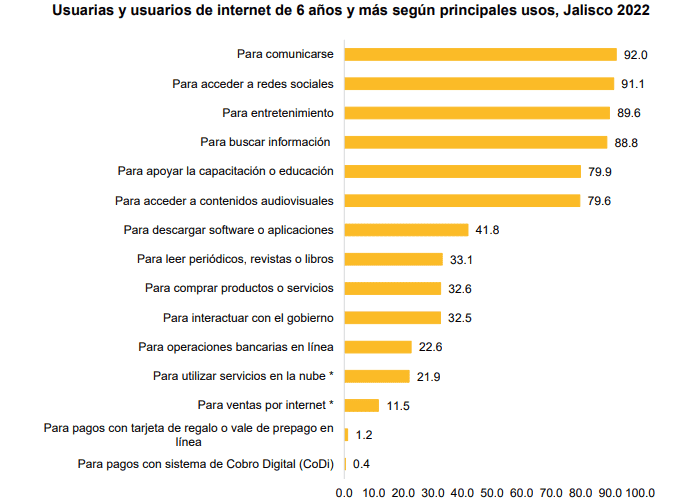 Con motivo del Día Mundial de la Televisión del pasado 21 de noviembre, el Instituto de Información Estadística y Geográfica (IIEG) de Jalisco presentó un análisis de los principales resultados de la Encuesta Nacional sobre Disponibilidad y Uso de Tecnologías de la Información en los Hogares (ENDUTIH) 2022, que realizó el Instituto Nacional de Estadística y Geografía (Inegi), en colaboración con el Instituto Federal de Telecomunicaciones (IFT). El estudio permitió conocer datos sobre el uso y la disponibilidad de las tecnologías en las casas, y entre otros, dejó conocer cómo usan los jaliscienses el Internet. Los datos de la encuesta muestran que en el año 2022, en Jalisco había 6 millones 532 mil 993 usuarios de Internet. El estudio contempló a personas de 6 años o más.En la distribución por sexo de los usuarios y usuarias de las tecnologías de información y comunicación en Jalisco, destaca que entre los de Internet, la mayoría eran mujeres, con un respectivo 52.2% (3 millones 407 mil 857) y 51.9% (3 millones 419 mil 420); mientras que entre los usuarios de computadora la mayoría eran hombres, con una proporción del 52.0% (un millón 531 mil 620).Destacan que de las y los usuarios de Internet en Jalisco, un 96.6% mencionó que tenía acceso a la red en su hogar, 54.5% en cualquier lugar mediante una conexión móvil, incluyendo un smartphone; mientras que, el 45.4% se conectaba en la casa de otra persona (amigo o familiar) y 42.8% en el trabajo. Asimismo, el 21.1% señaló que tenía conexión de internet en la escuela o institución educativa, 19.7% en un sitio público con costo y 13.5% en un sitio público sin costo.Los principales usos del Internet por los jaliscienses son más variados, no obstante, un 92.0% de las y los usuarios jaliscienses de la red lo usaban para comunicarse, el 91.1% mencionó que lo utilizaba para acceder a redes sociales, 89.6% para entretenimiento, 88.8% para buscar información, 79.9% para apoyar la capacitación o educación y 79.6% para acceder a contenidos audiovisuales.Entre los usos menos frecuentes estuvo el pago con sistema de Cobro Digital (CoDi) con un 0.4% de las y los usuarios; seguido de los pagos con tarjeta de regalo o vale de prepago en línea con 1.2%, ventas por internet el 11.5%, para utilizar servicios en la nube un 21.9% y para operaciones bancarias en línea con el 22.6%.*Mantente al día con las noticias, únete a nuestro canal de WhatsAppOF