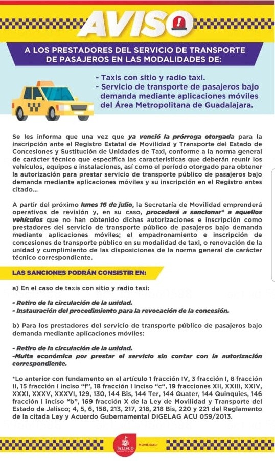 Alrededor de las 11:30 horas del lunes, decenas de conductores de Uber y otras Empresas de Redes de Transporte (ERT) comenzaron una manifestación con bloqueo a la circulación en la zona de La Minerva.Los conductores están inconformes con el registro que les exige la autoridad para este tipo de plataformas y cuyo plazo para el cumplimiento venció justo ayer 15 de julio. Los quejosos señalan que las exigencias de la autoridad estatal son excesivas.Previo a llegar a este punto, los conductores inconformes realizaron una marcha lenta por avenida Vallarta y después de estar en la Minerva partirán hacia las instalaciones de la Secretaría de Movilidad en Prolongación Alcalde y Circunvalación.En tanto, la Policía Vial de la Secretaría de Movilidad tiene presencia en la zona pero no han podido evitar que al menos tres de los carriles en la glorieta estén bloqueados por los manifestantes. La semana pasada la Secretaría de Movilidad había anticipado que a partir de este lunes empezarían los operativos para revisar "y en su caso, proceder a sancionar a aquellos vehículos que no han obtenido las autorizaciones e inscripción como prestadores del servicio de transporte público de pasajeros bajo demanda mediante aplicaciones móviles".Al menos otras dos manifestaciones ocurren durante la mañana del lunes en Guadalajara.En la zona de La Normal, personas inconformes con la Secretaría de Educación Jalisco cerraron los carriles centrales de Alcalde de Norte a Sur.Mientras que al mediodía un contingente de Antorcha Campesina avanza por Hidalgo desde Chapultepec hacía Palacio de Gobierno en el Centro tapatío. Esta movilización obliga a modificar las rutas del transporte público que circulan por la zona, tal es el caso de las Líneas 1 y 3 del Sitren.Otro grupo de manifestantes se reunía en el Nodo Colón en Américas y López Mateos sin causar complicaciones a la vialidad.(Con información de Rubí Bobadilla)